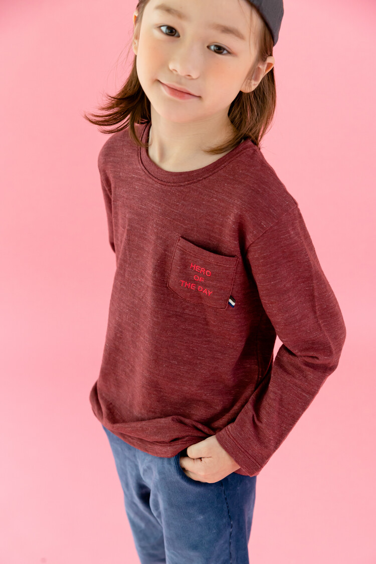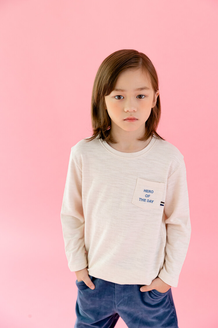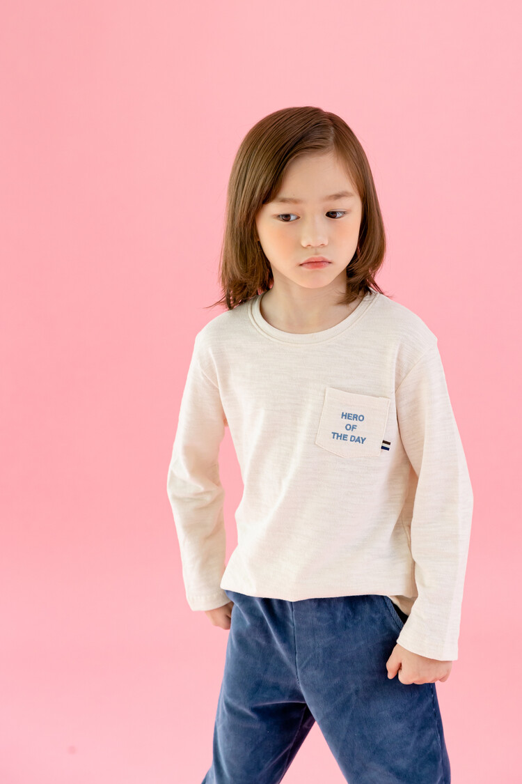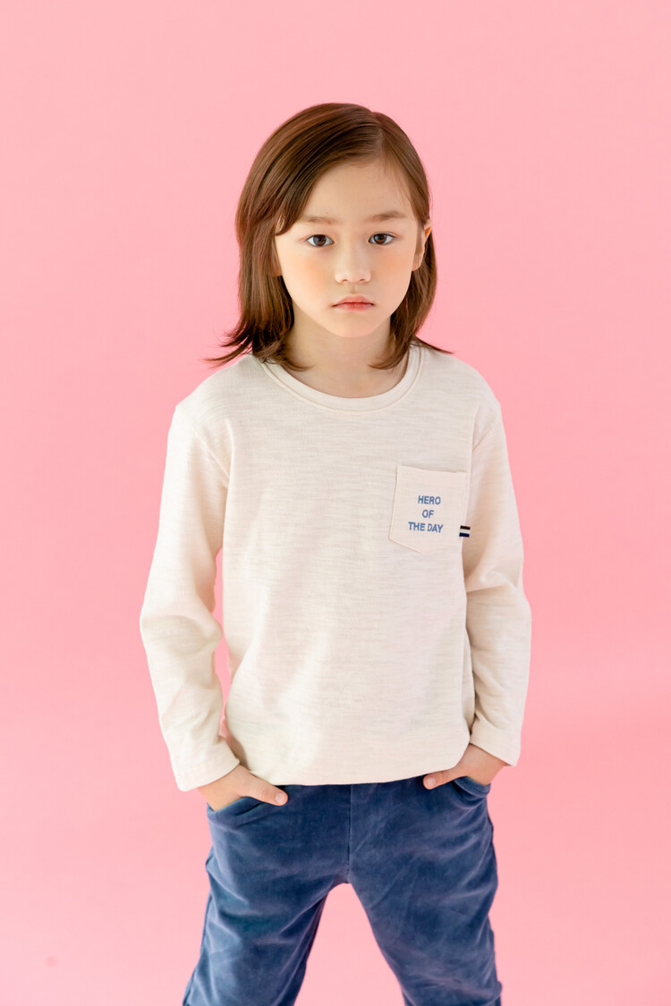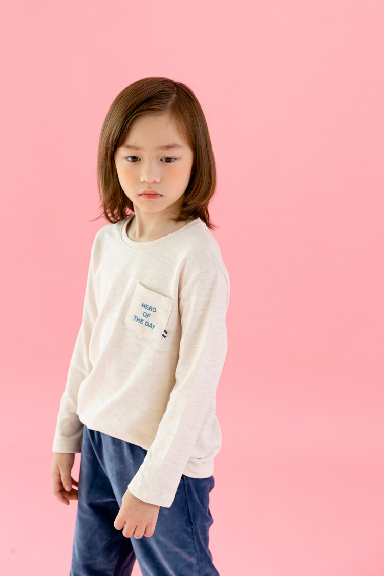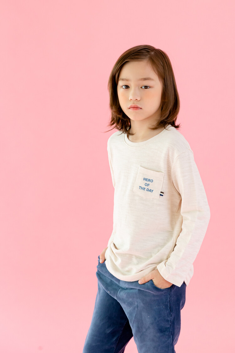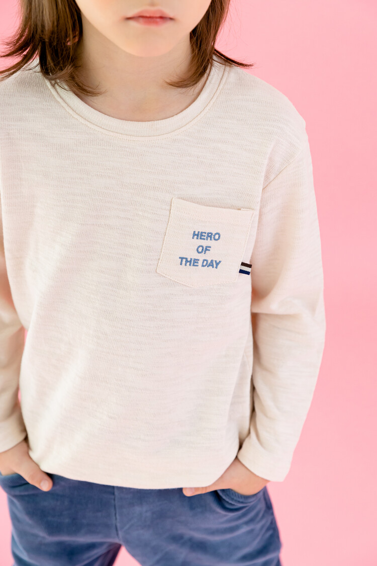 귀여운 자수 "Hero of The Day" (오늘의 영웅!)가 돋보이는 루즈핏 긴팔 티셔츠를 만나보세요. 부드러운 면으로 제작된 남아용 긴팔 티셔츠는 3가지 칼라로 선보입니다.