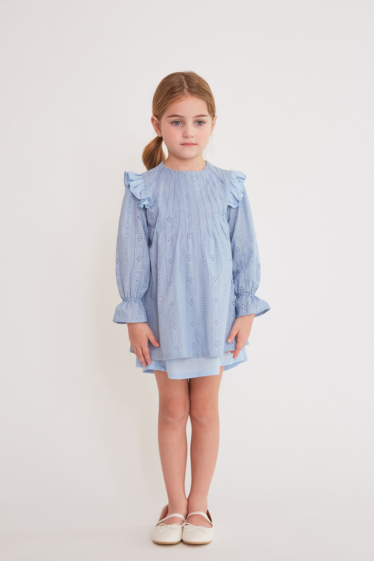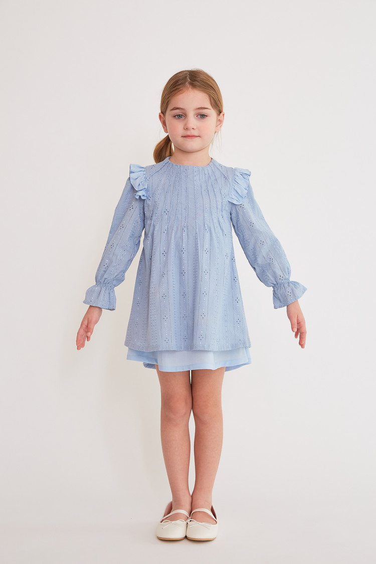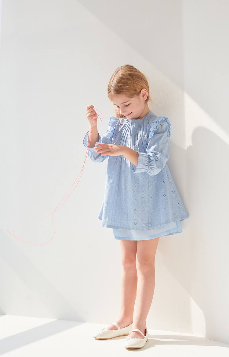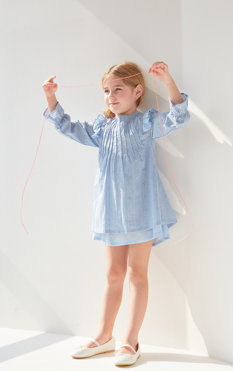 부드러운 블루 색상과 정교한 핀턱 디테일이 돋보이는 COCCA의 Teapot Blue Pin-tuck Dress를 만나보세요. 반짝이는 자수 실이 돋보이는 부드러운 코튼 소재로 제작하였으며, 깔끔한 핀턱 디테일과 어깨 러플이 프릴 소매와 조화를 이루는 디자인입니다. 발레 플랫과 매치하여 브랜드가 추구하는 내추럴한 무드를 표현해보세요.
