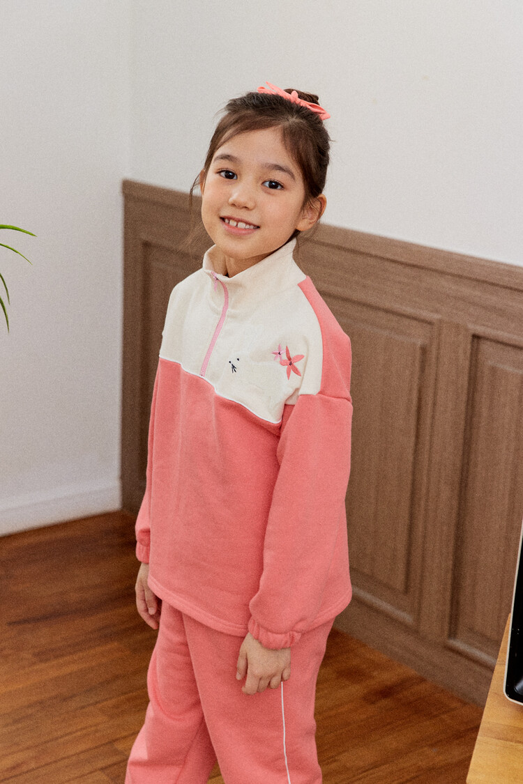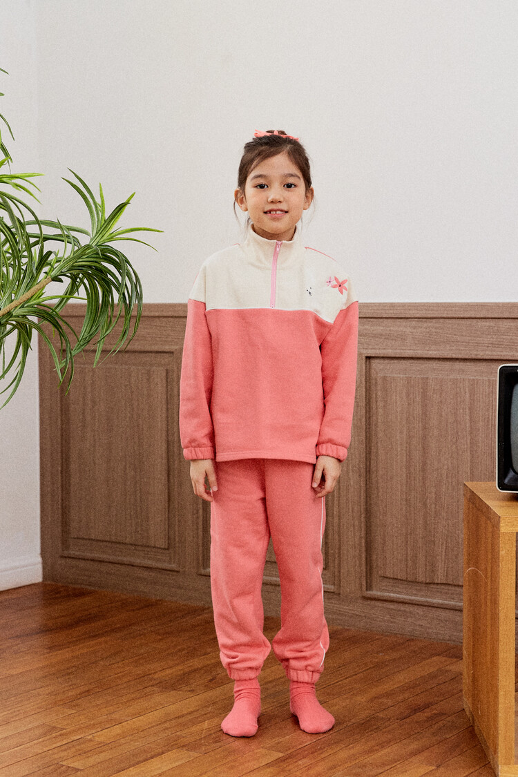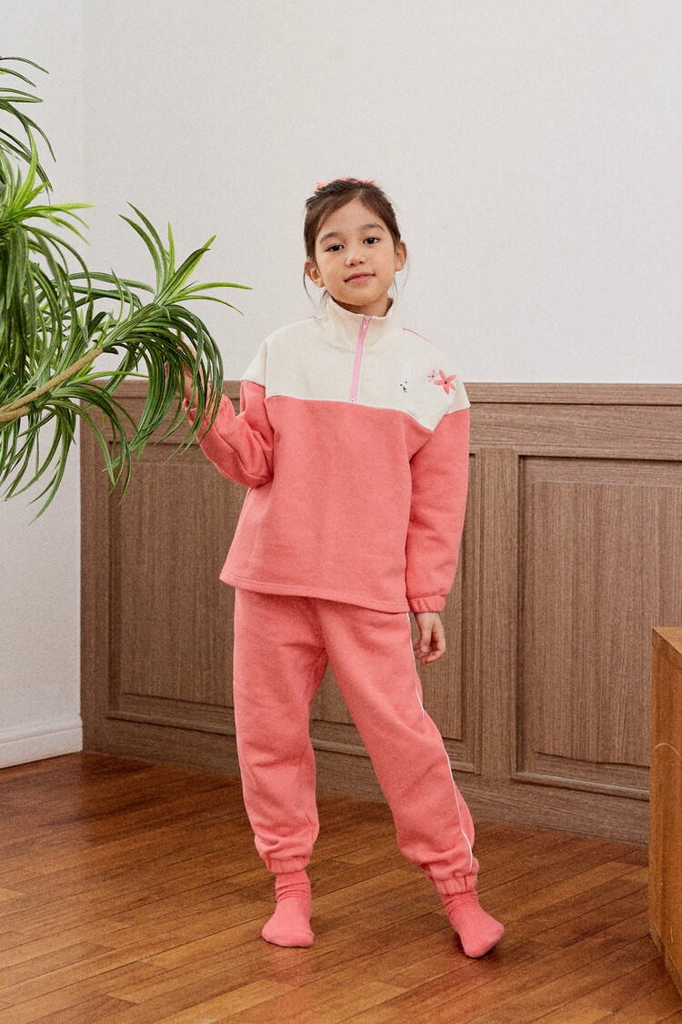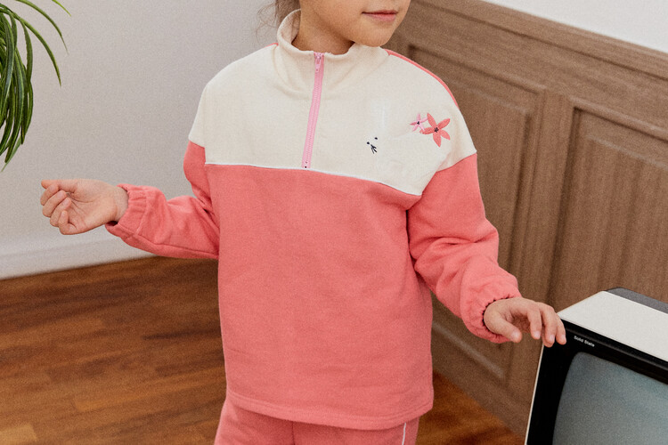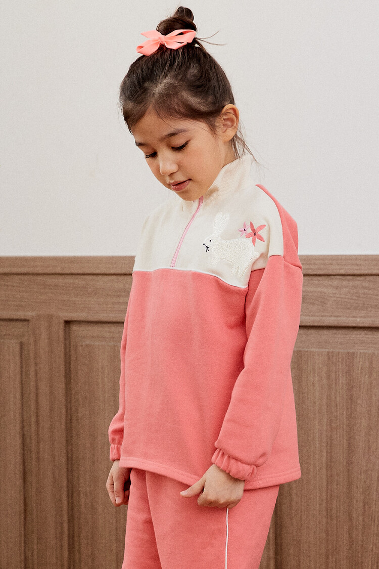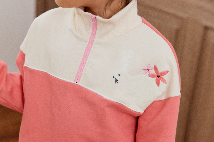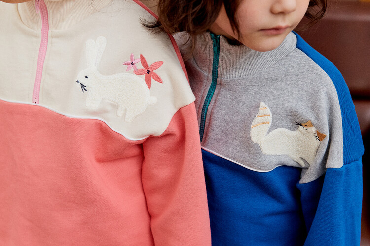 코카의 부드러운 쮸리 원단으로 제작된 하프 집엎 배색 츄리닝을 만들어보세요. 뽀글이 토끼와 꽃 자수가 특징인 디자인이랍니다.