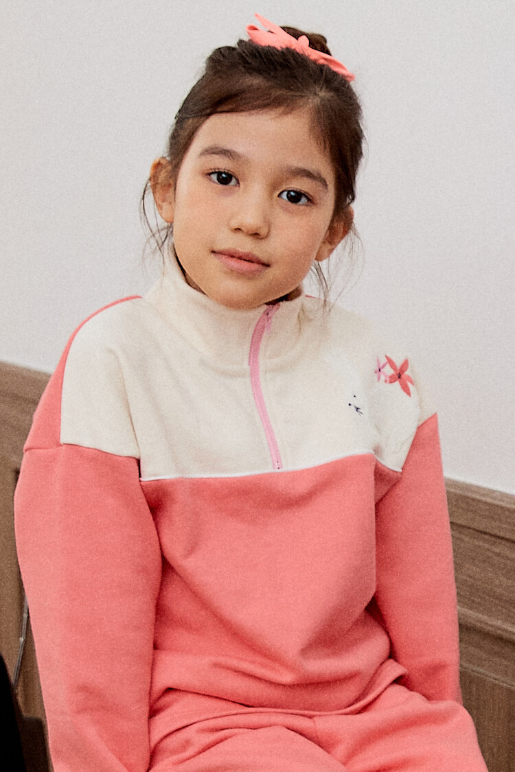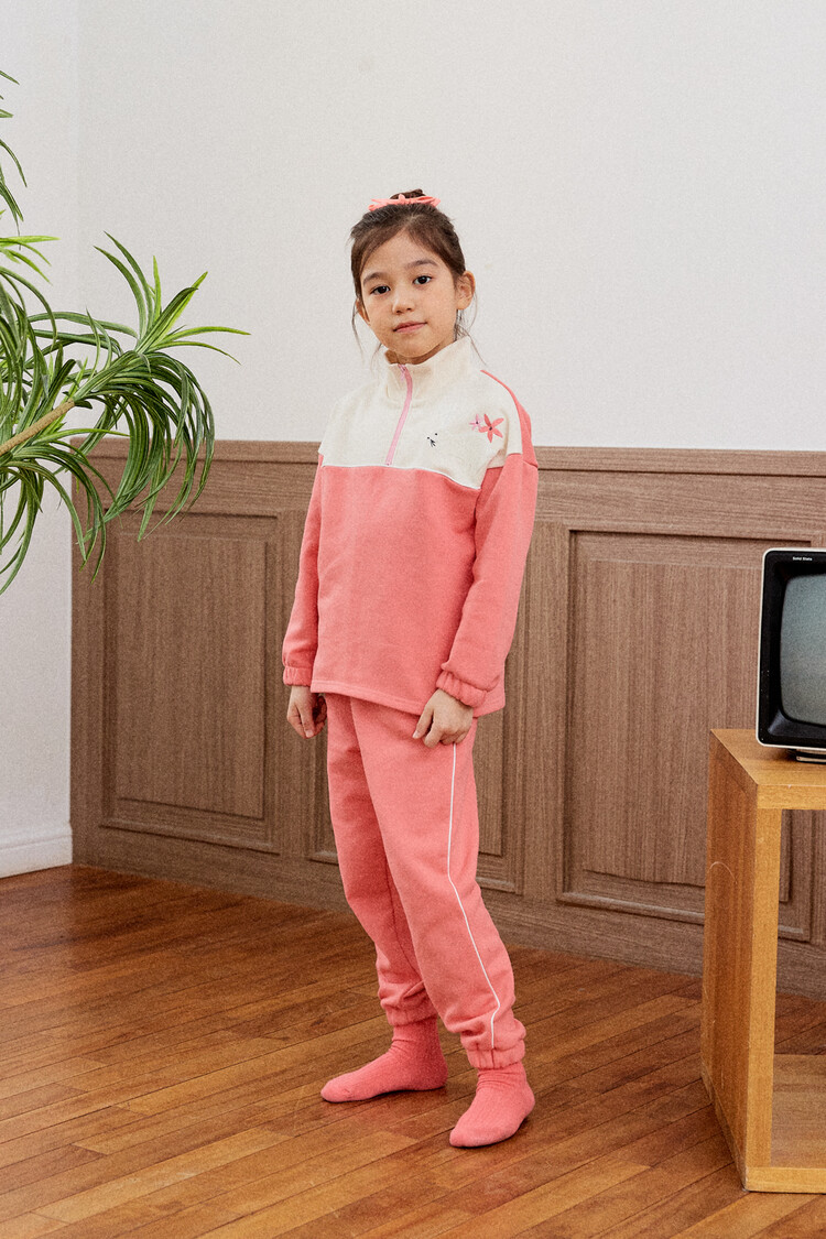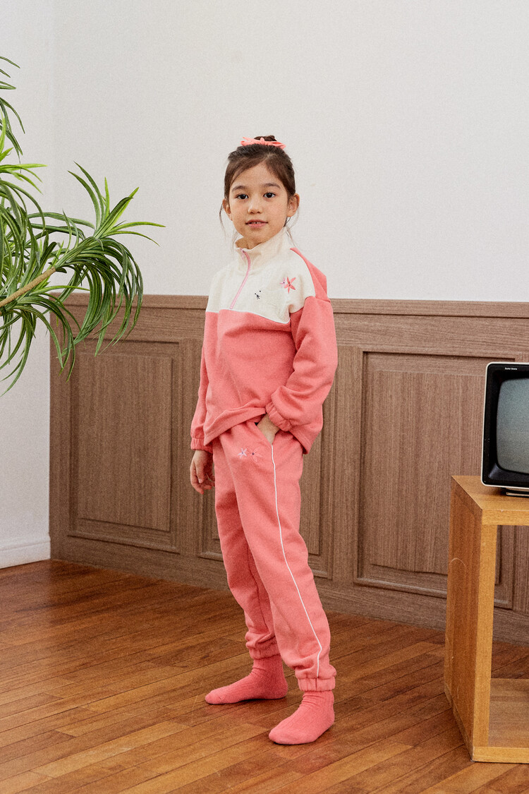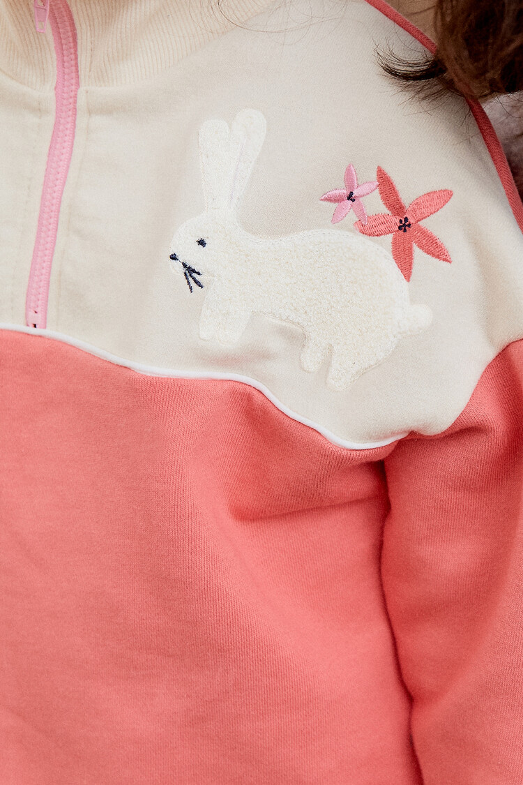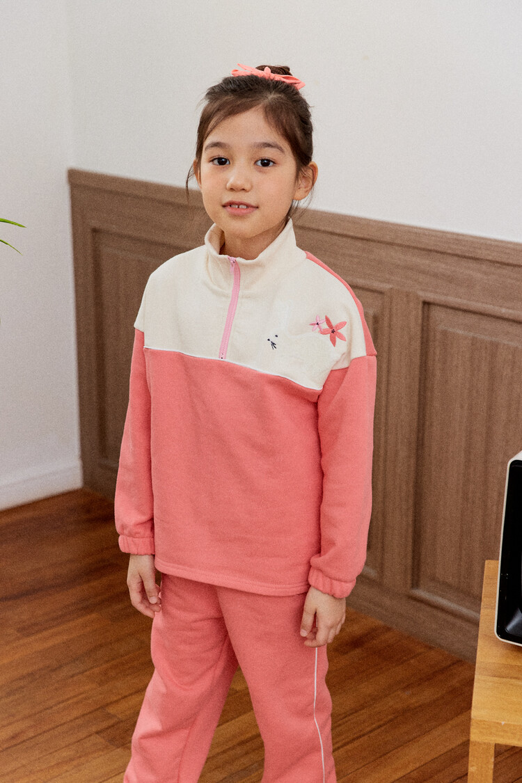 코카의 부드러운 쮸리 원단으로 제작된 하프 집엎 배색 츄리닝을 만들어보세요. 뽀글이 토끼와 꽃 자수가 특징인 디자인이랍니다.