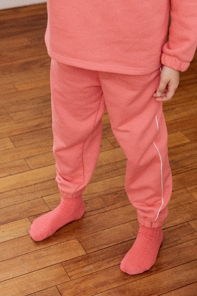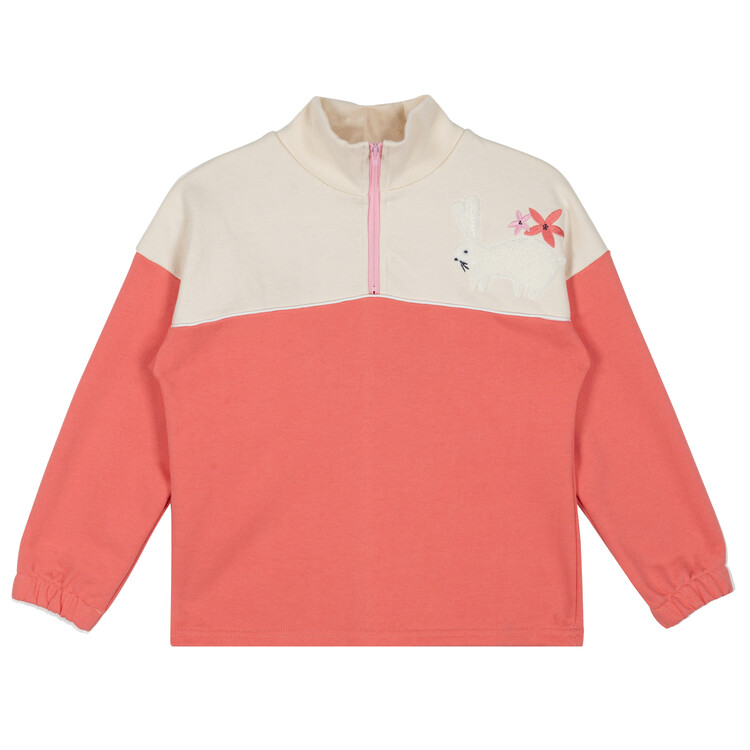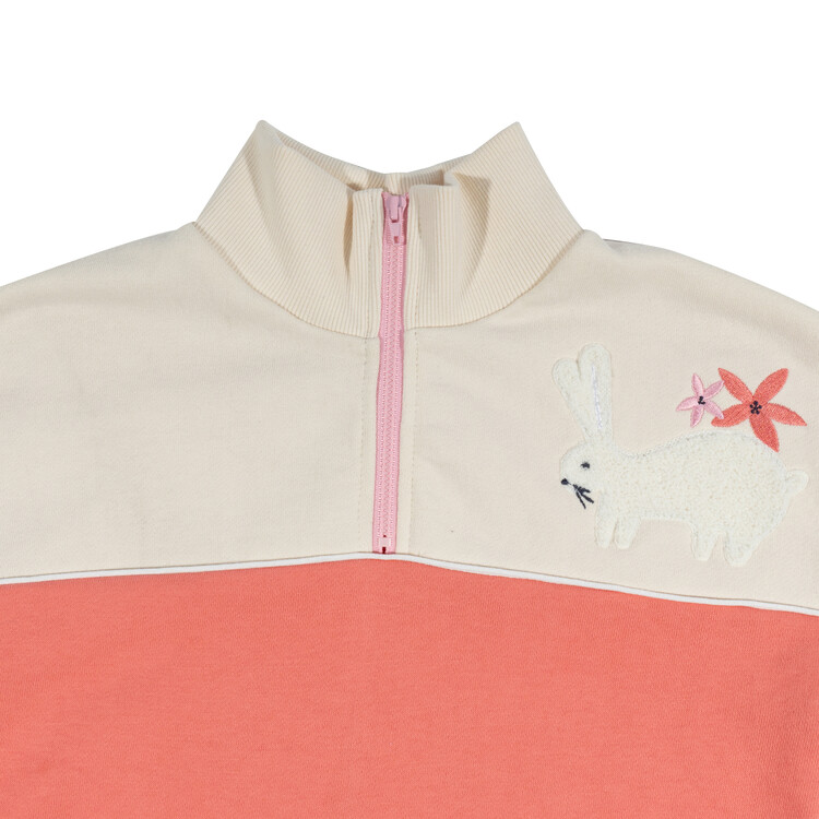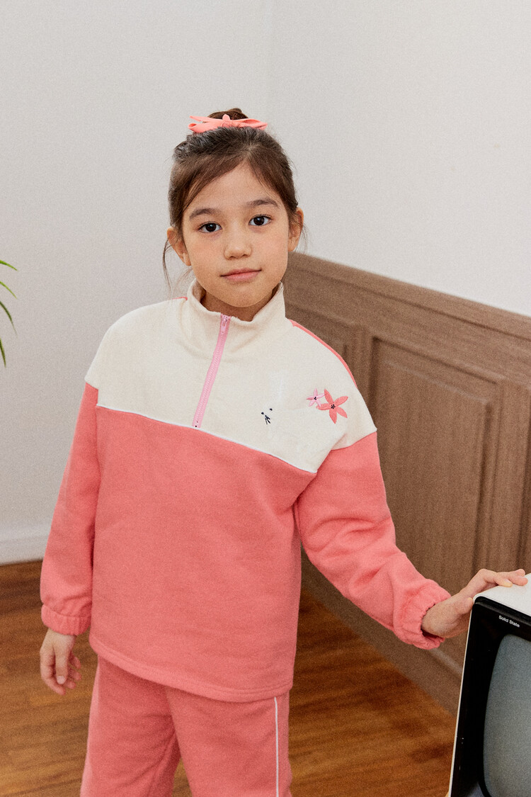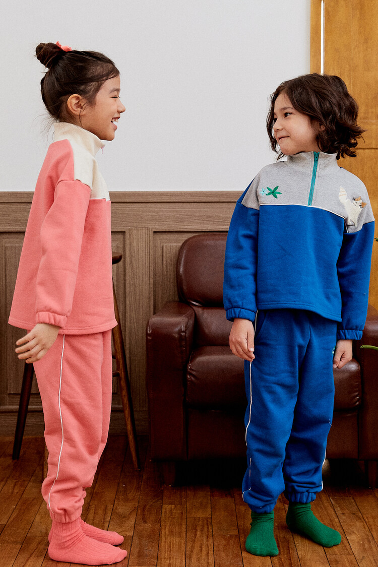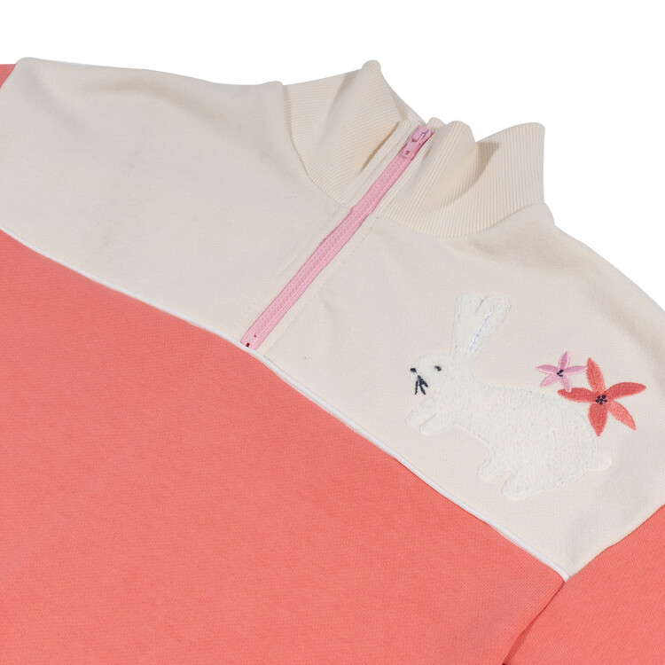 코카의 부드러운 쮸리 원단으로 제작된 하프 집엎 배색 츄리닝을 만들어보세요. 뽀글이 토끼와 꽃 자수가 특징인 디자인이랍니다.