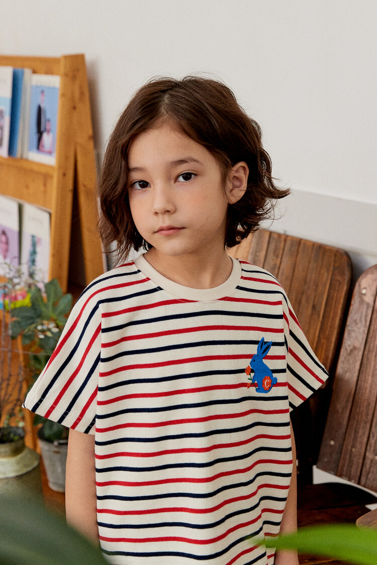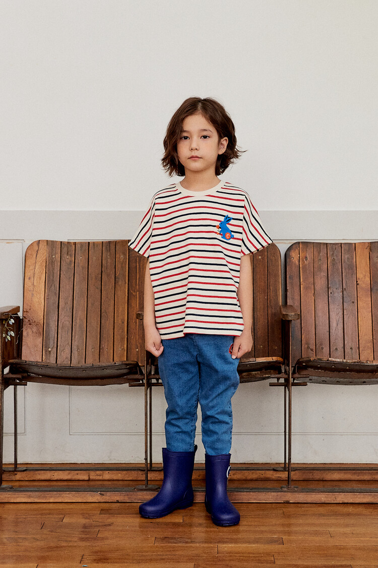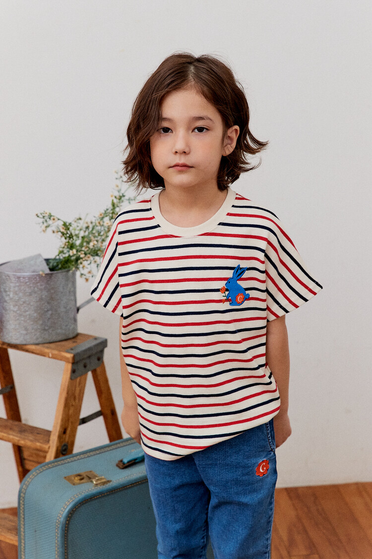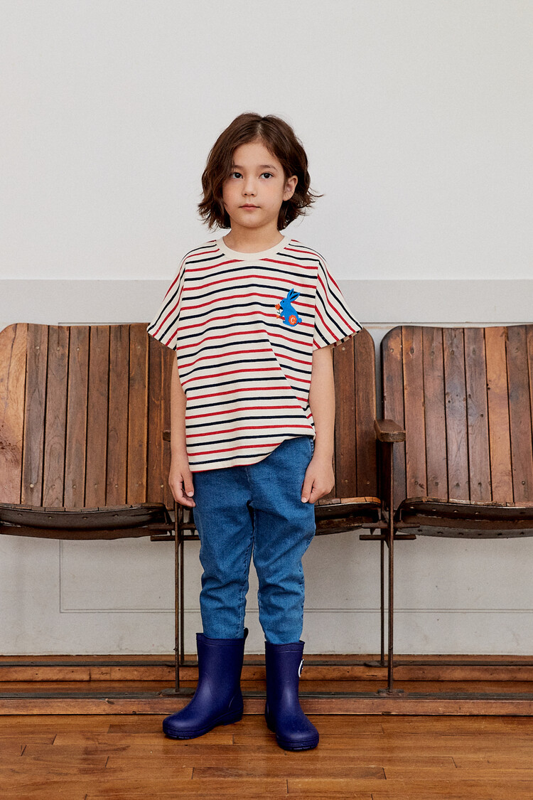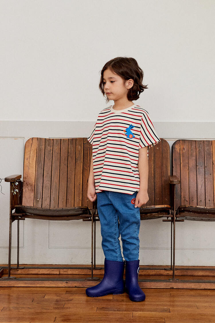 오렌지 튤립을 들고 있는 코발트 토끼 자수가 매력적인 티셔츠입니다. 다크한 네이비와 레드 스트라이프 원단으로 제작된 이 티는 원단이 너무 좋아서 세탁 후에도 그대로 모양을 유지하실거에요. 받아보시면 후회없으실 제품이랍니다. 코카의 스판 데님 치노팬츠와 매치하여 우리 아이들의 봄 룩을 완성시켜주세요^^