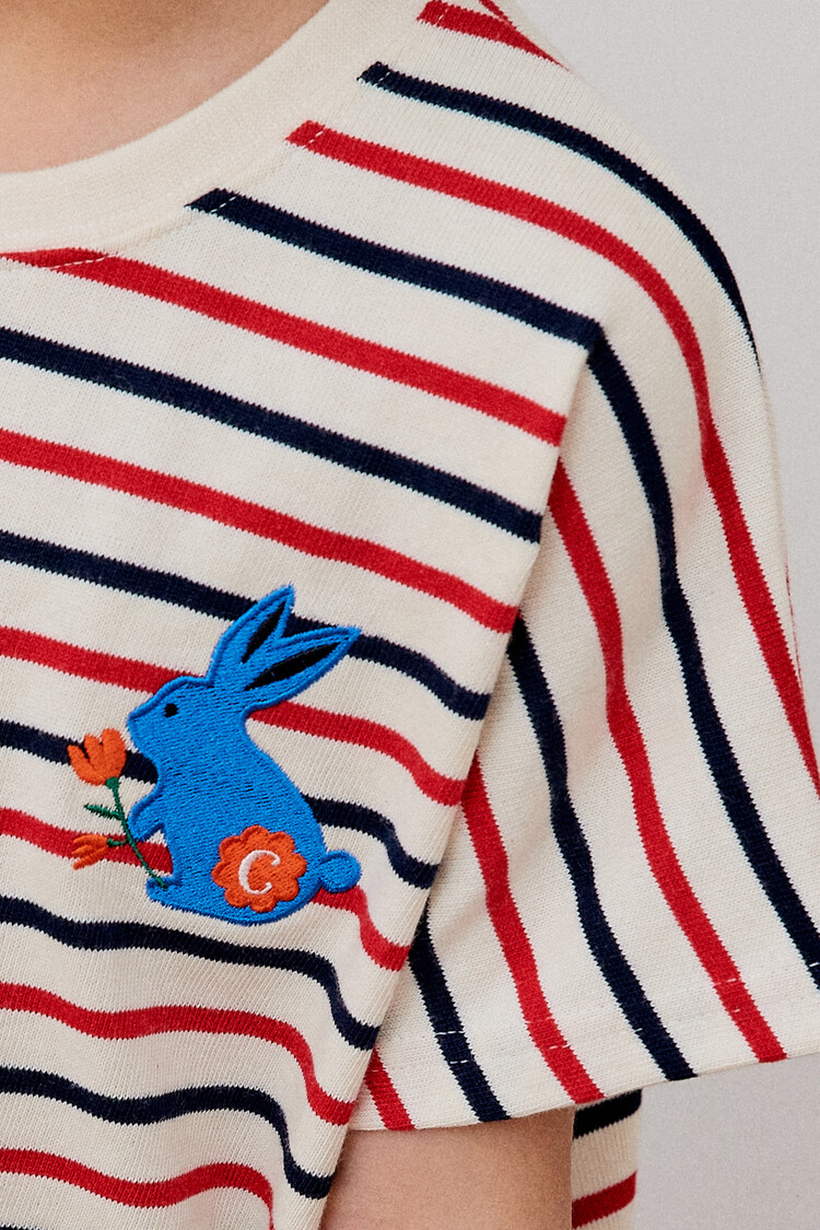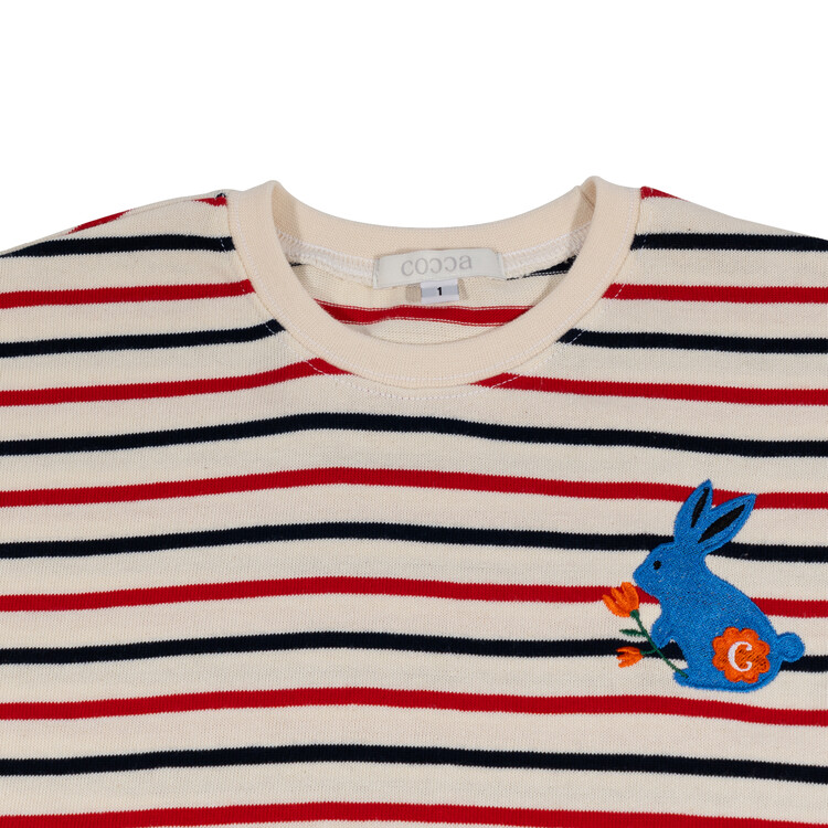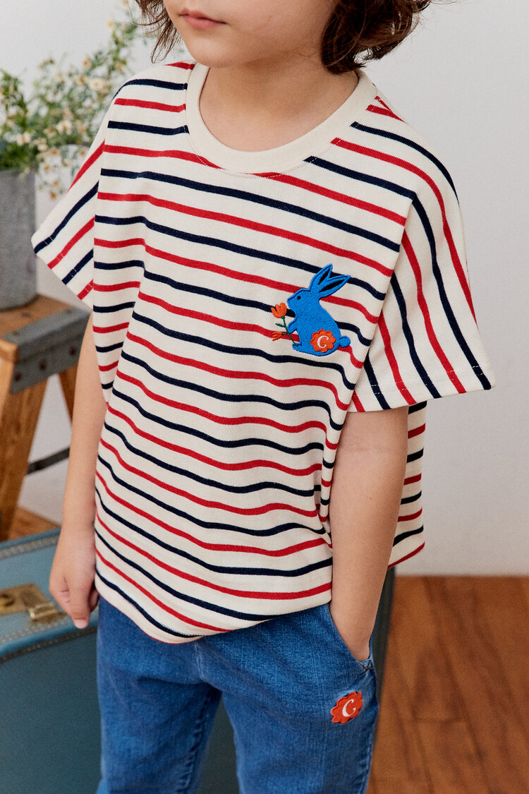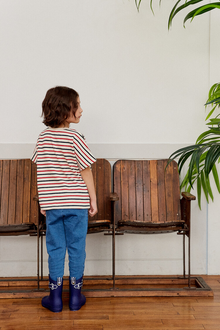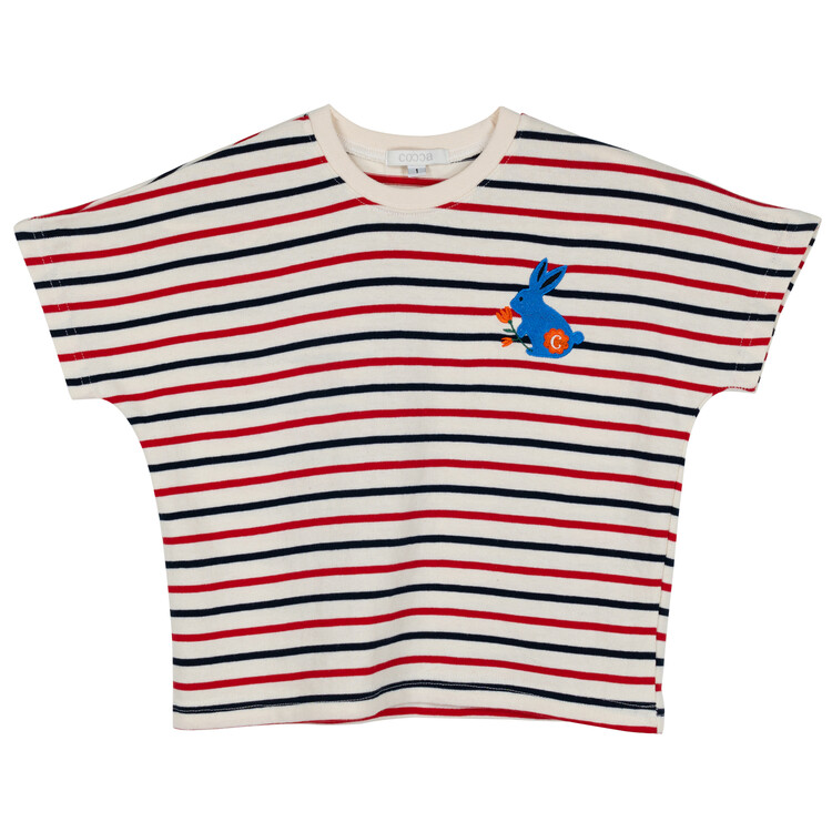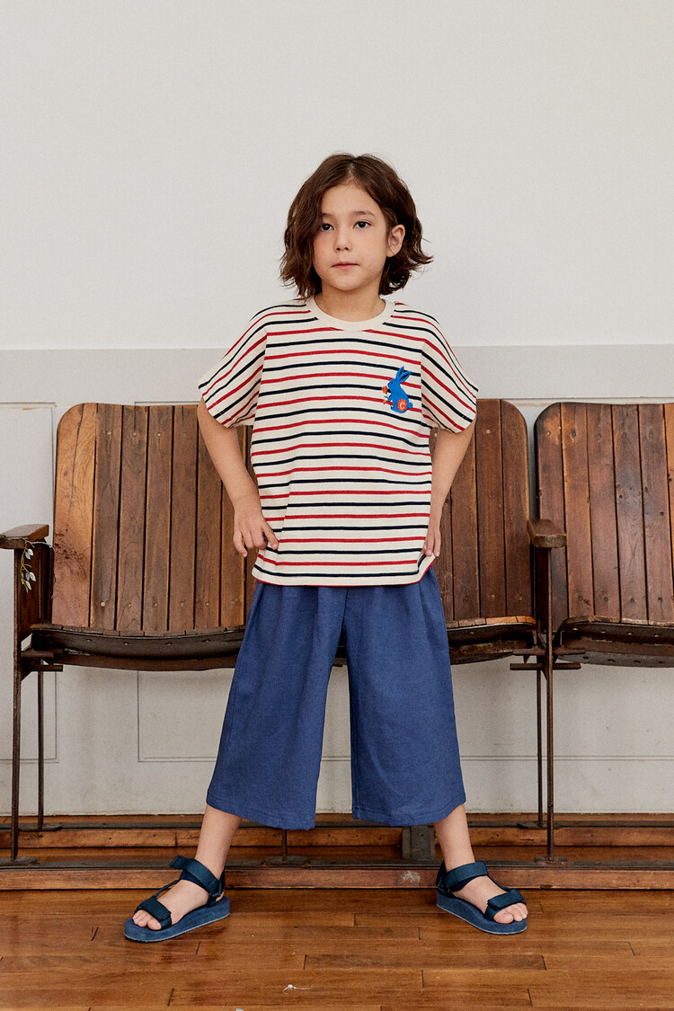 오렌지 튤립을 들고 있는 코발트 토끼 자수가 매력적인 티셔츠입니다. 다크한 네이비와 레드 스트라이프 원단으로 제작된 이 티는 원단이 너무 좋아서 세탁 후에도 그대로 모양을 유지하실거에요. 받아보시면 후회없으실 제품이랍니다. 코카의 스판 데님 치노팬츠와 매치하여 우리 아이들의 봄 룩을 완성시켜주세요^^