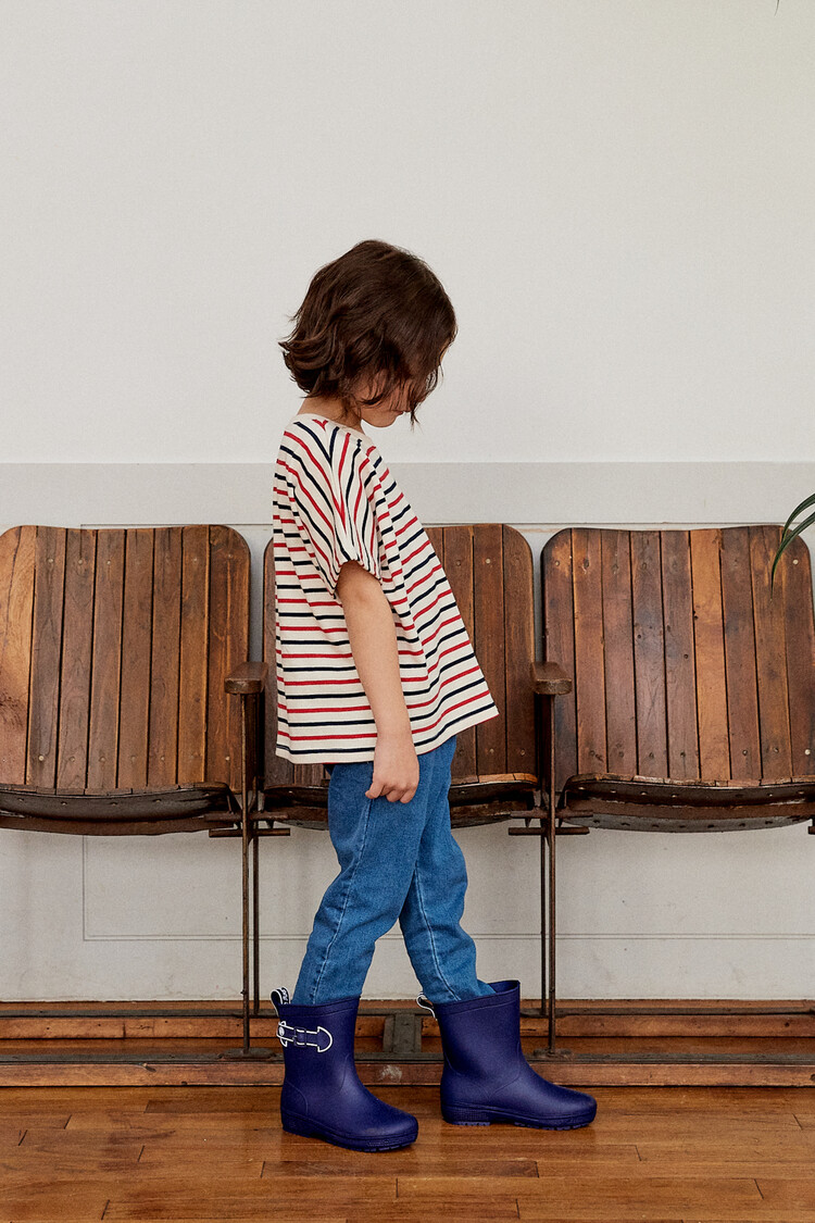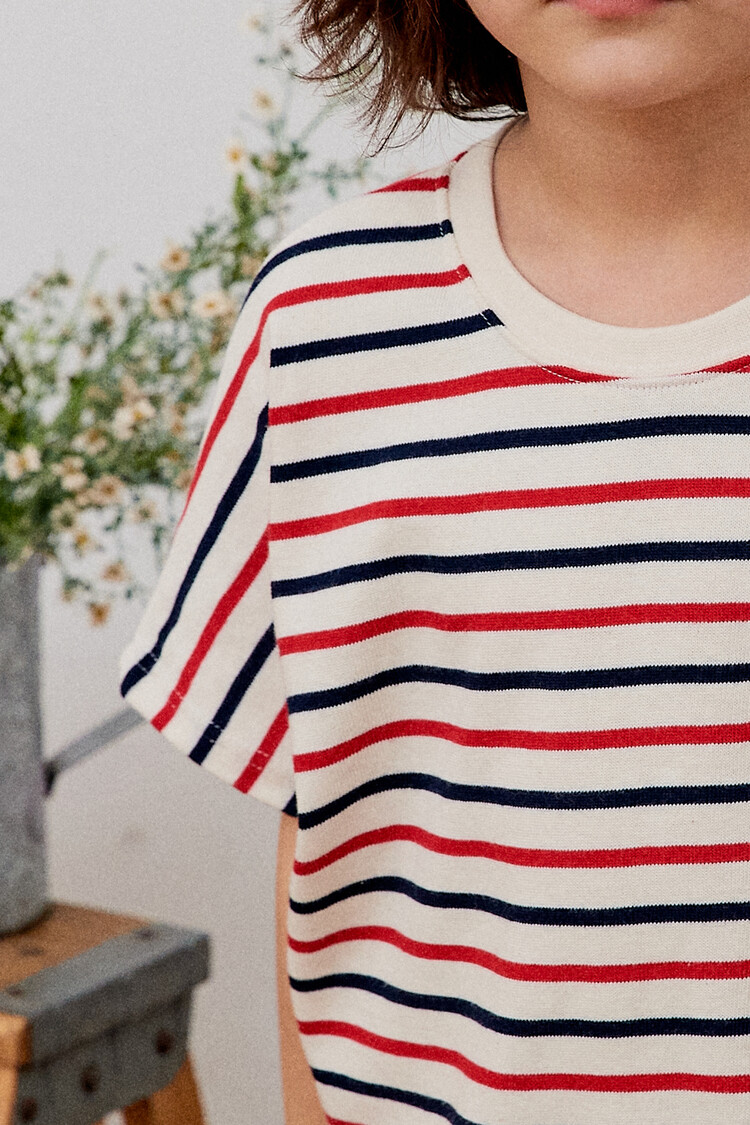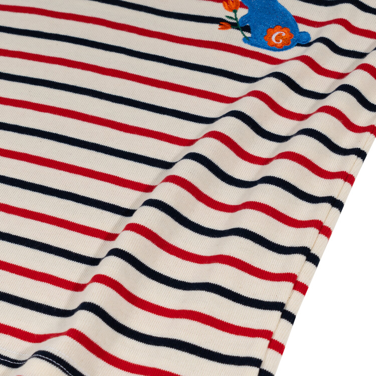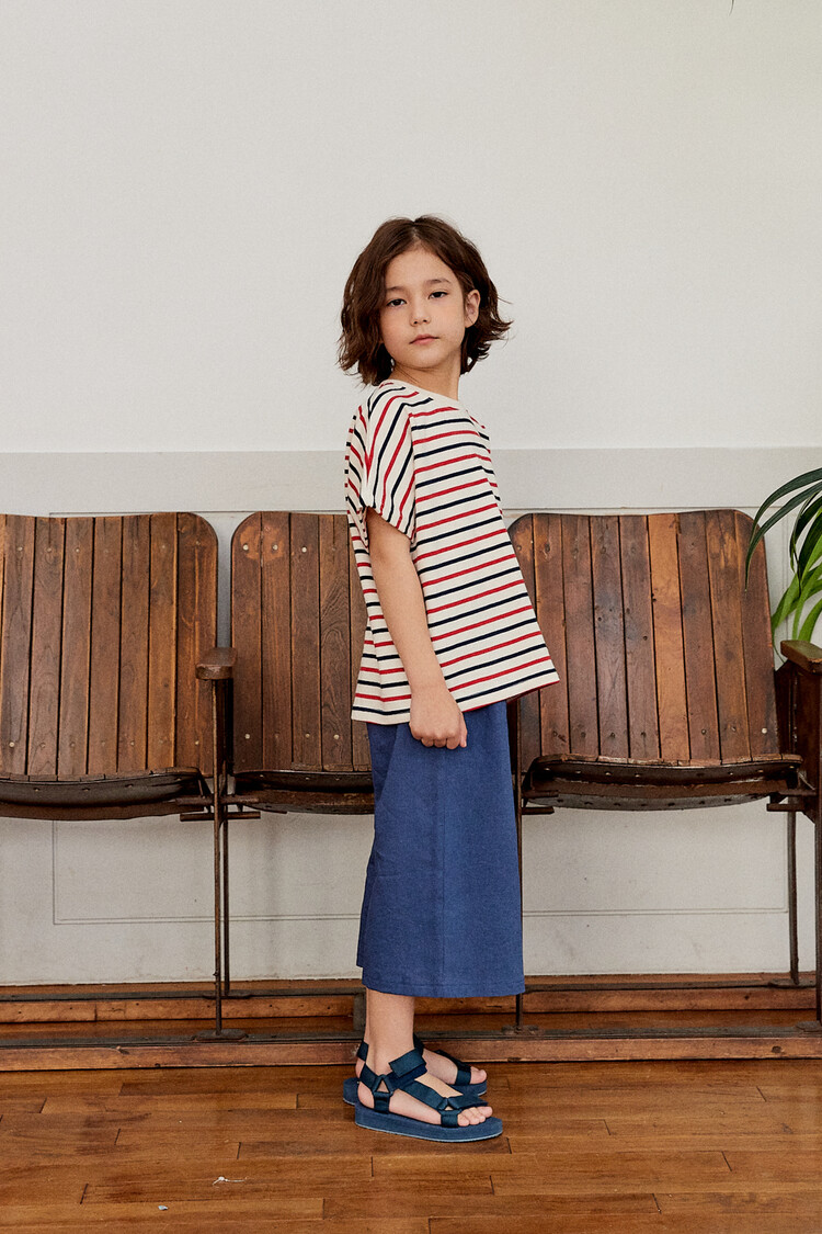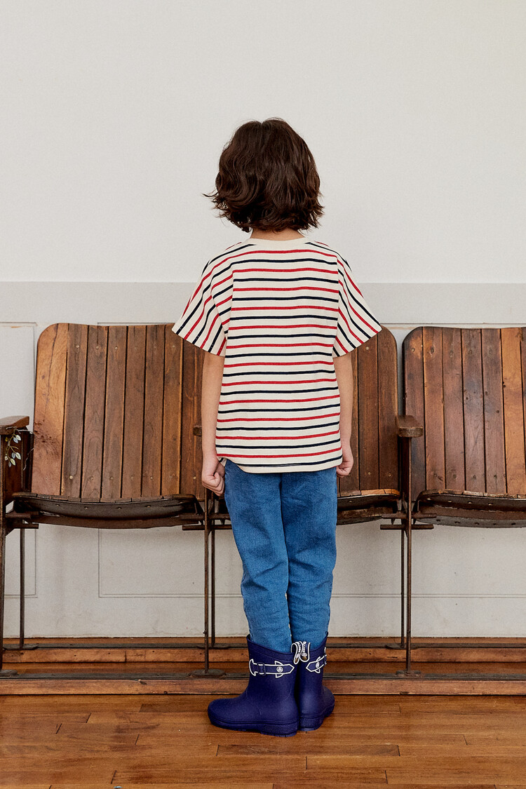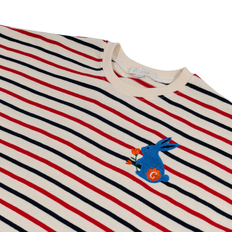 오렌지 튤립을 들고 있는 코발트 토끼 자수가 매력적인 티셔츠입니다. 다크한 네이비와 레드 스트라이프 원단으로 제작된 이 티는 원단이 너무 좋아서 세탁 후에도 그대로 모양을 유지하실거에요. 받아보시면 후회없으실 제품이랍니다. 코카의 스판 데님 치노팬츠와 매치하여 우리 아이들의 봄 룩을 완성시켜주세요^^