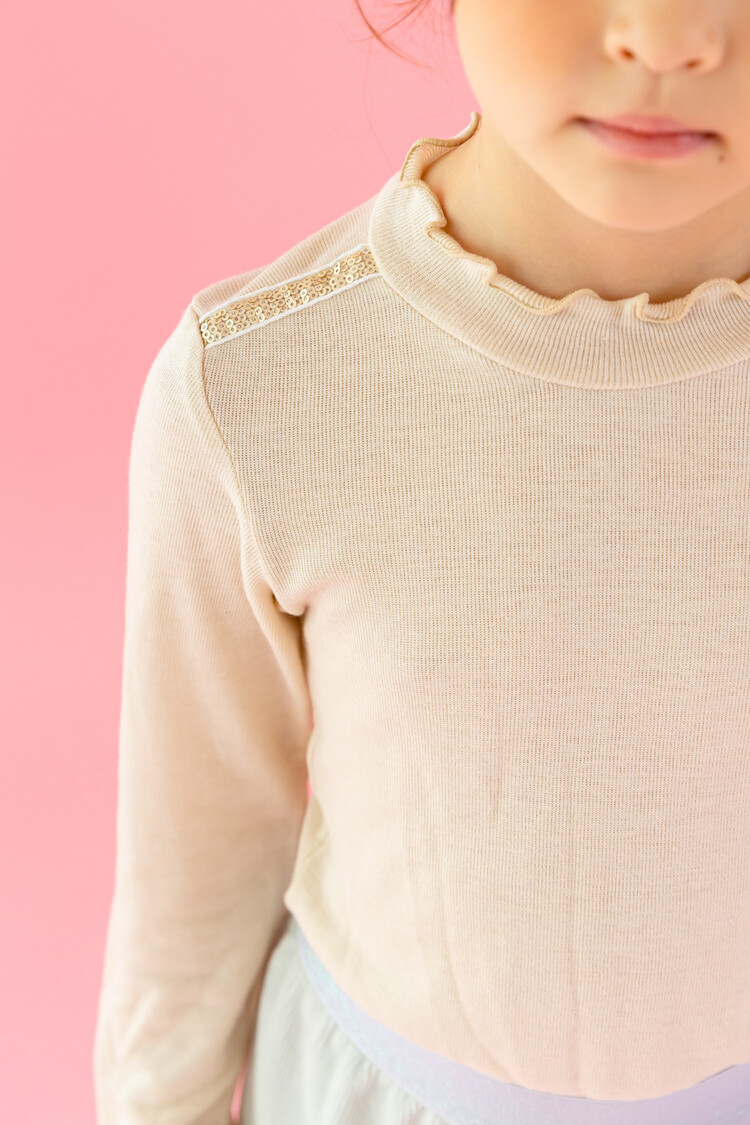 매우 부드러운 신축성 있는 니트로 제작된 여아 니트 탑을 만나보세요. 넥라인과 소매의 프릴은 탄탄하게 마감 되었으며, 어깨의 시퀸스(비즈) 디테일 리본이 특징인 니트탑이에요. 이너용으로도 편안하게 입히실 수 있는 상품이며, 레이온이 함유되어 있는 원단으로, 너무 부드러워서 놀라실거에요. 코카 플로럴 자가드 니트 스커트와 매치하여 우리 아이들에게 따뜻한 가을 겨울 룩을 선물해주세요!