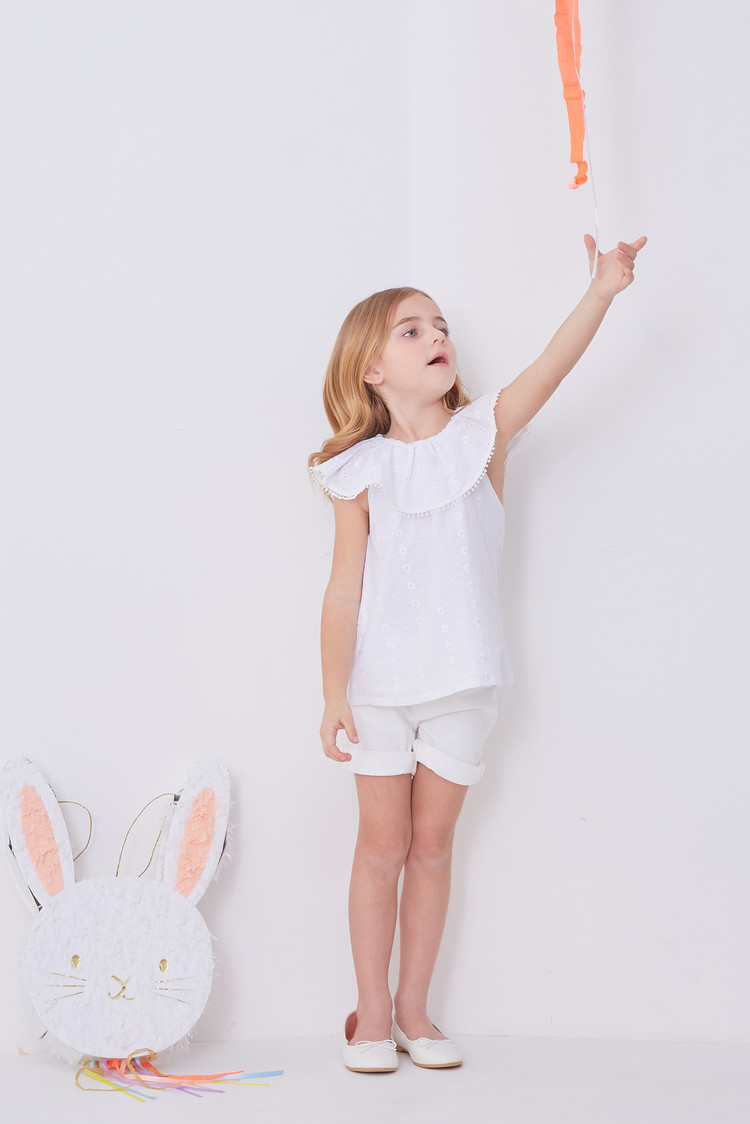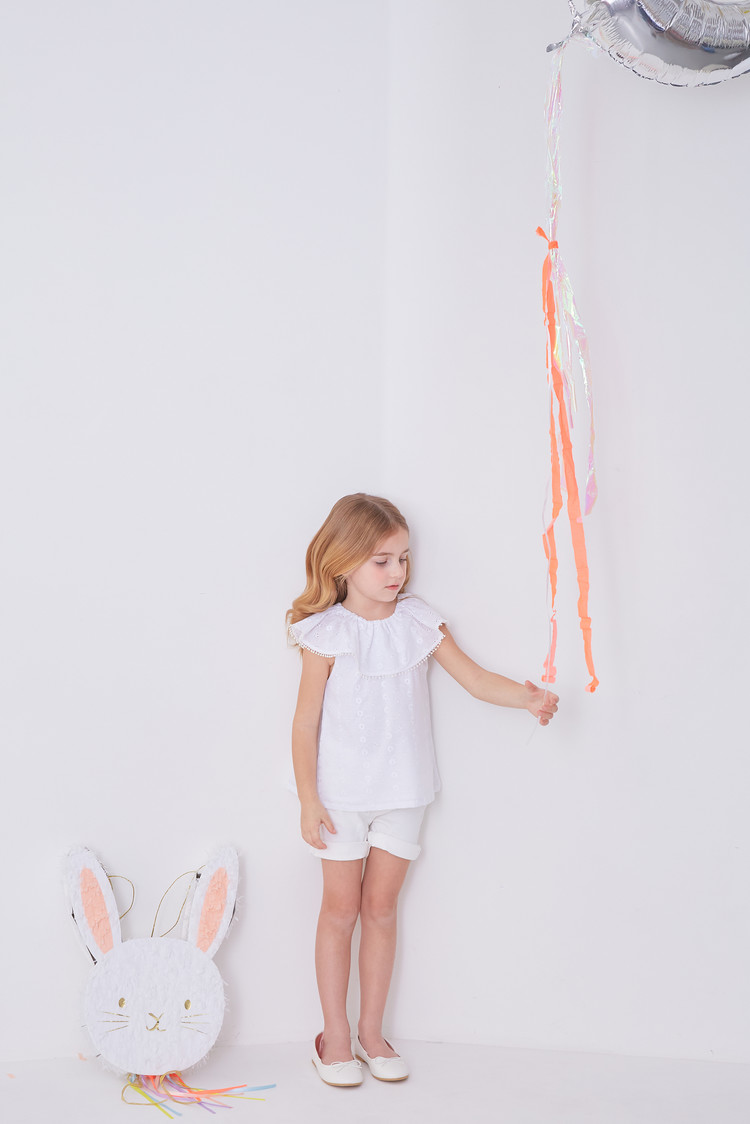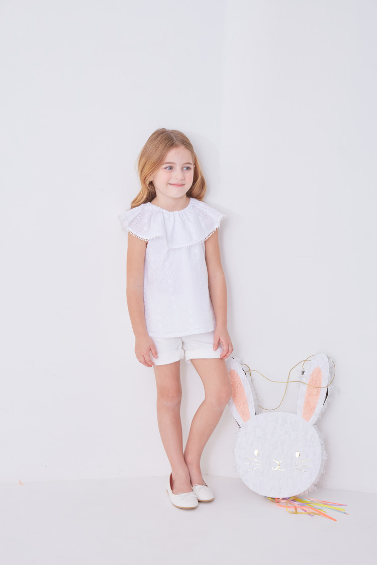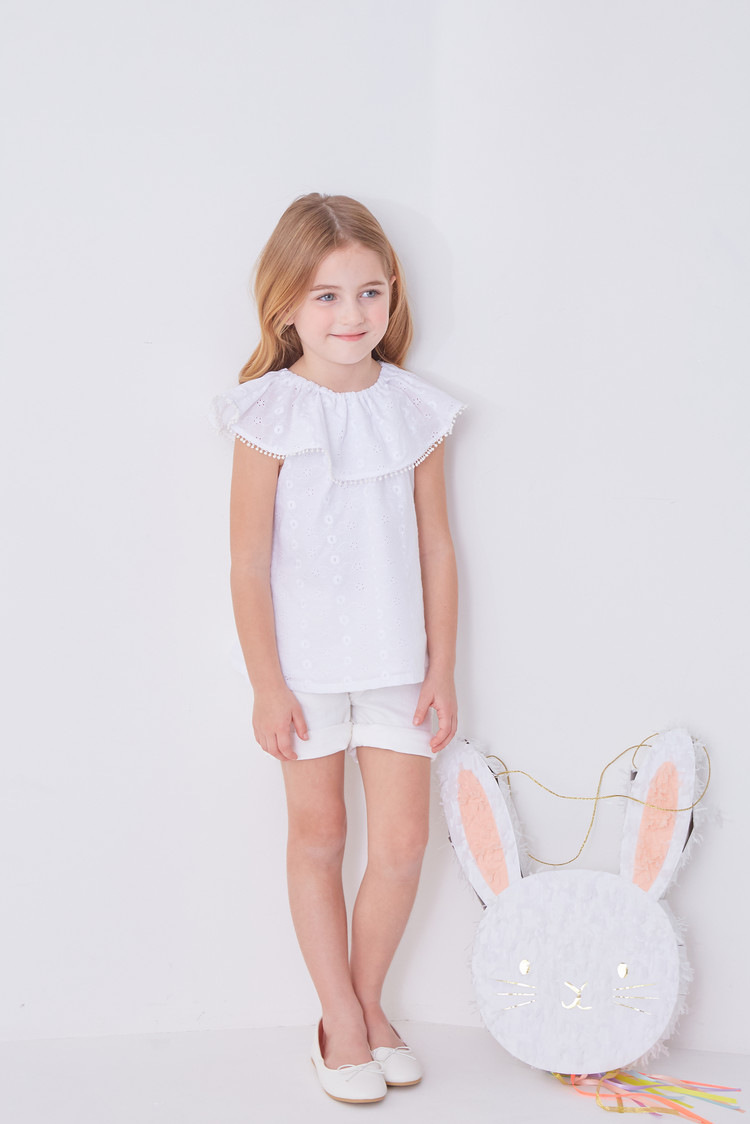 깨끗한 화이트 색상의 플로럴 자수가 돋보이는 탑입니다. 부드러운 60수 아사 원단의 안감으로 제작 되어 비침 걱정이 없으며, 넥 라인의 고무줄 마감으로 편안하고 쉽게 착용할 수 있습니다. 다가오는 여름을 맞이하여 우리 아이들에게 예쁜 옷을 선물해주세요.