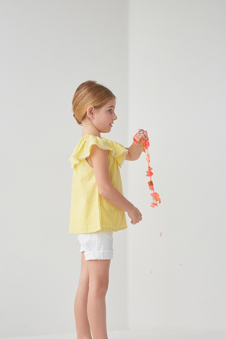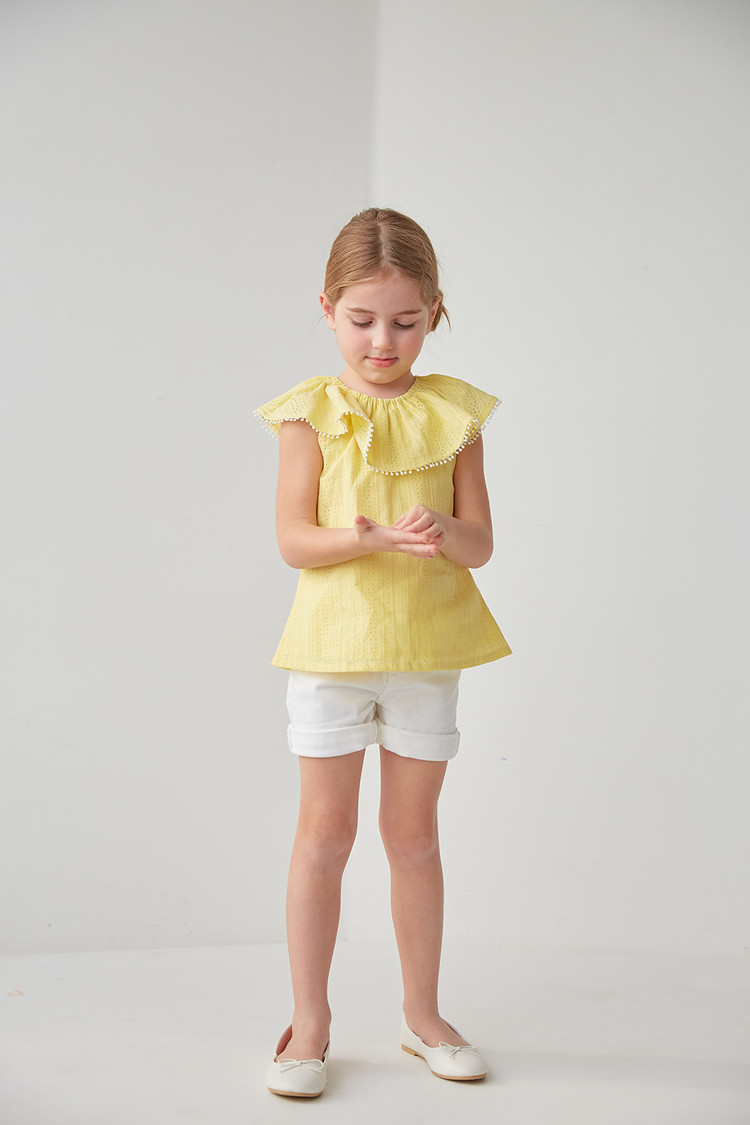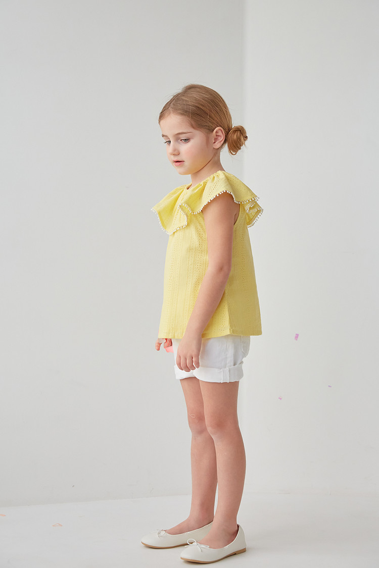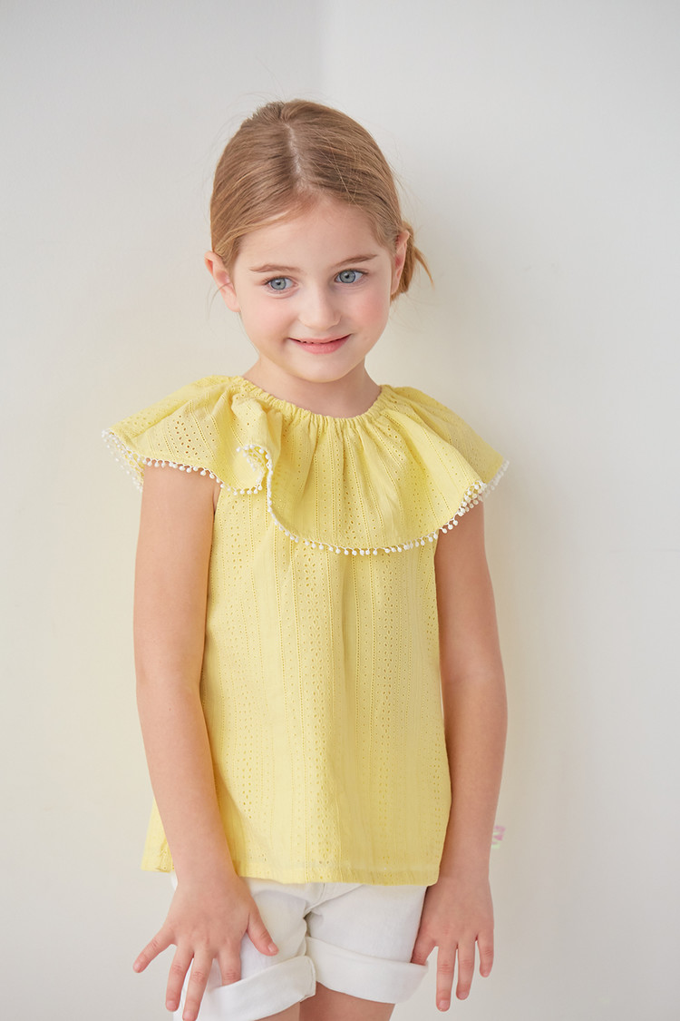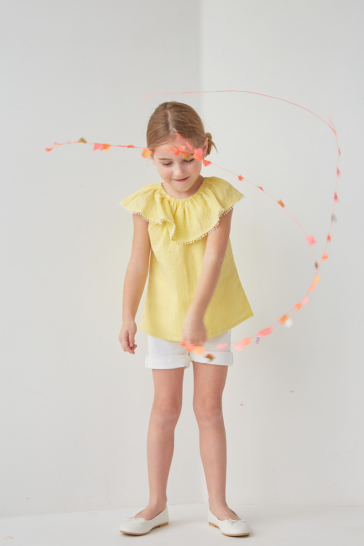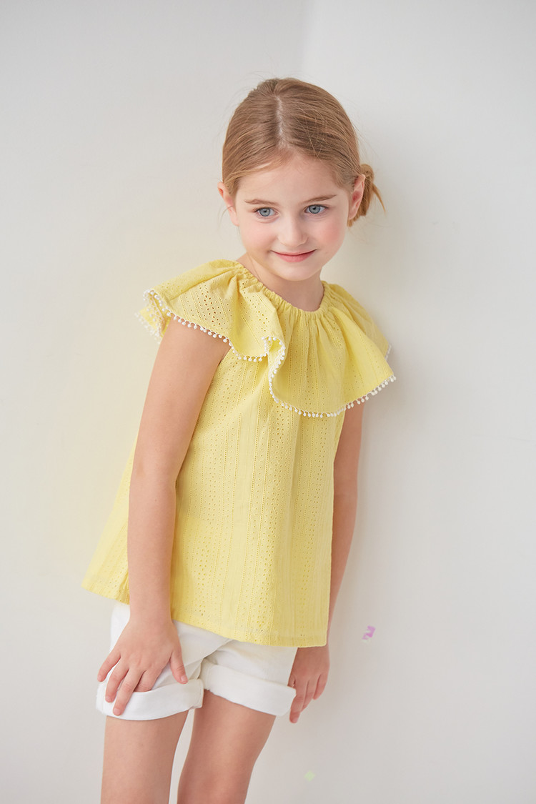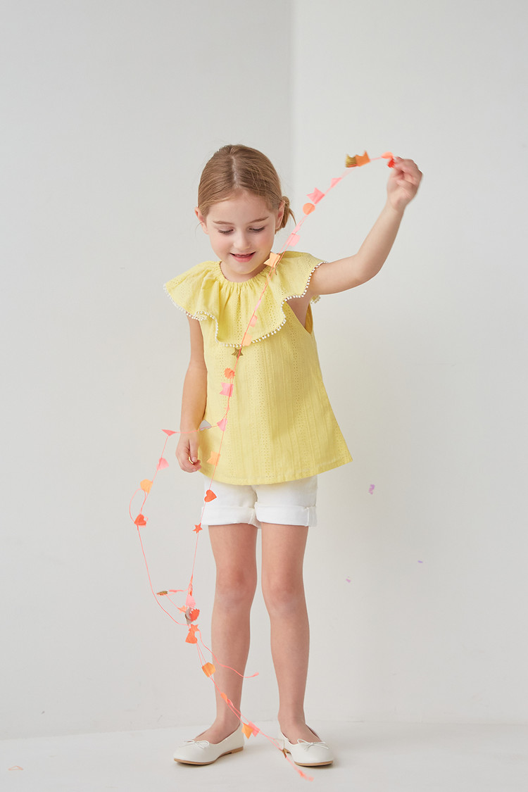 밝은 색상의 옐로우 플로럴 아일렛이 돋보이는 탑입니다. 부드러운 60수 아사 원단의 안감으로 제작 되어 비침 걱정이 없으며, 넥 라인의 고무줄 마감으로 편안하고 쉽게 착용할 수 있습니다. 다가오는 여름을 맞이하여 우리 아이들에게 예쁜 옷을 선물해주세요.