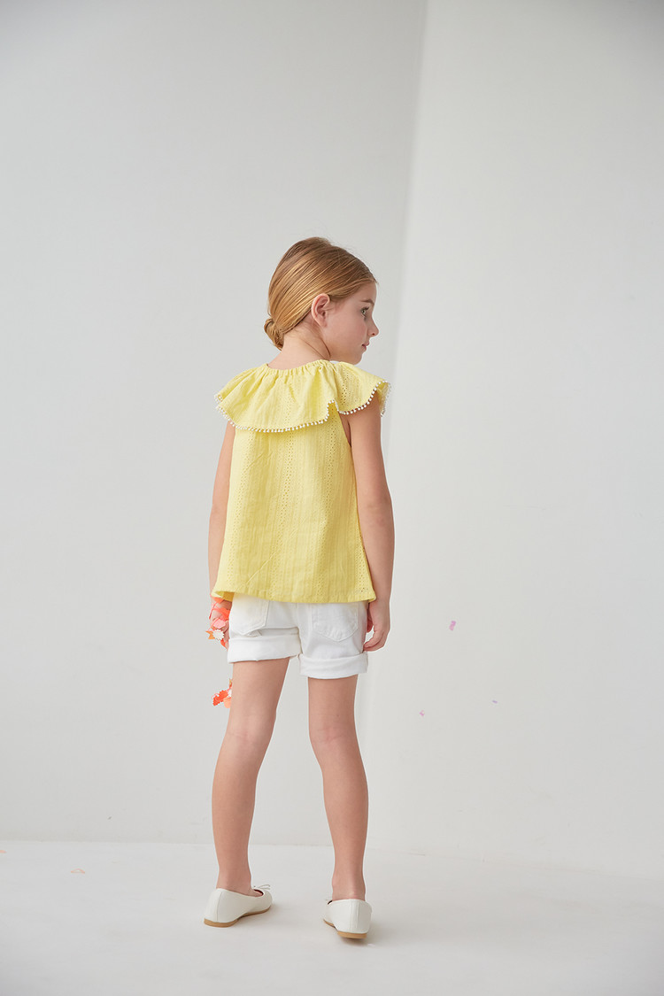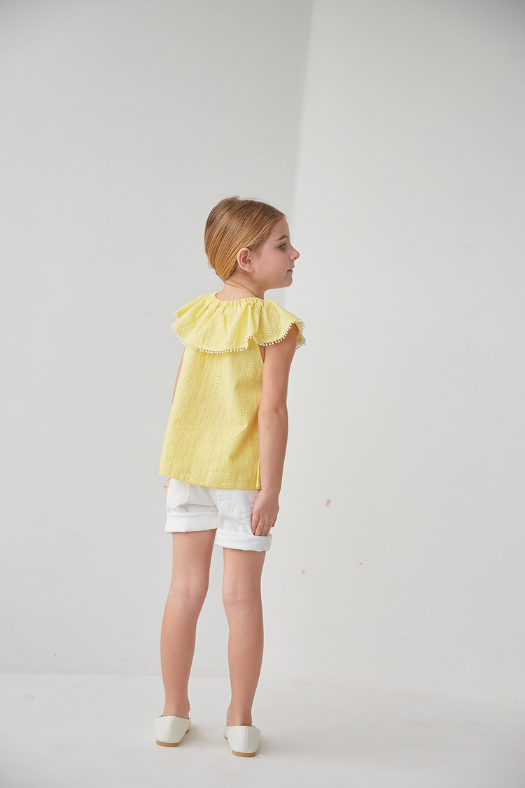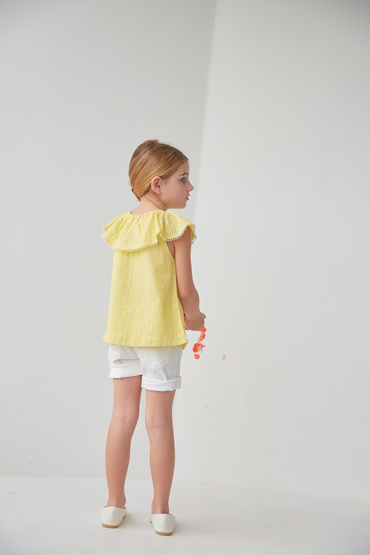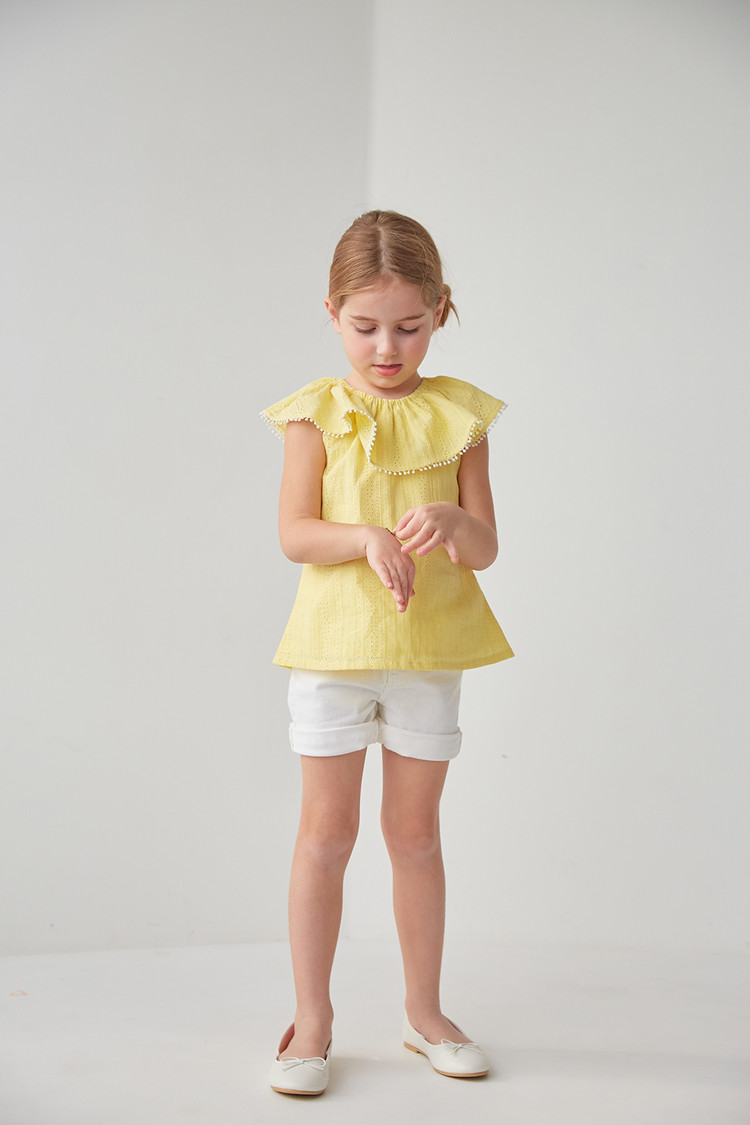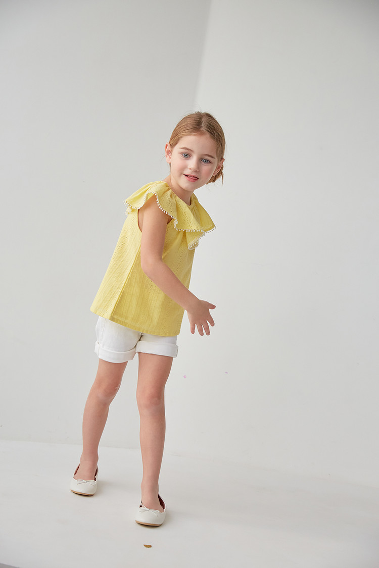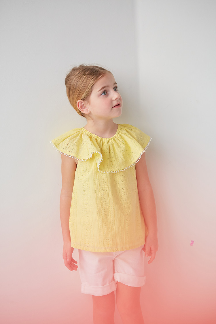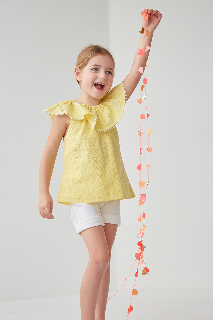 밝은 색상의 옐로우 플로럴 아일렛이 돋보이는 탑입니다. 부드러운 60수 아사 원단의 안감으로 제작 되어 비침 걱정이 없으며, 넥 라인의 고무줄 마감으로 편안하고 쉽게 착용할 수 있습니다. 다가오는 여름을 맞이하여 우리 아이들에게 예쁜 옷을 선물해주세요.