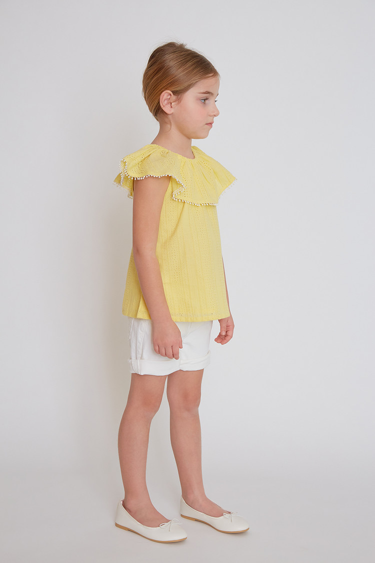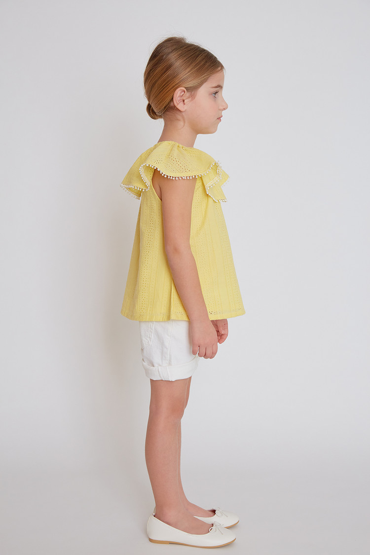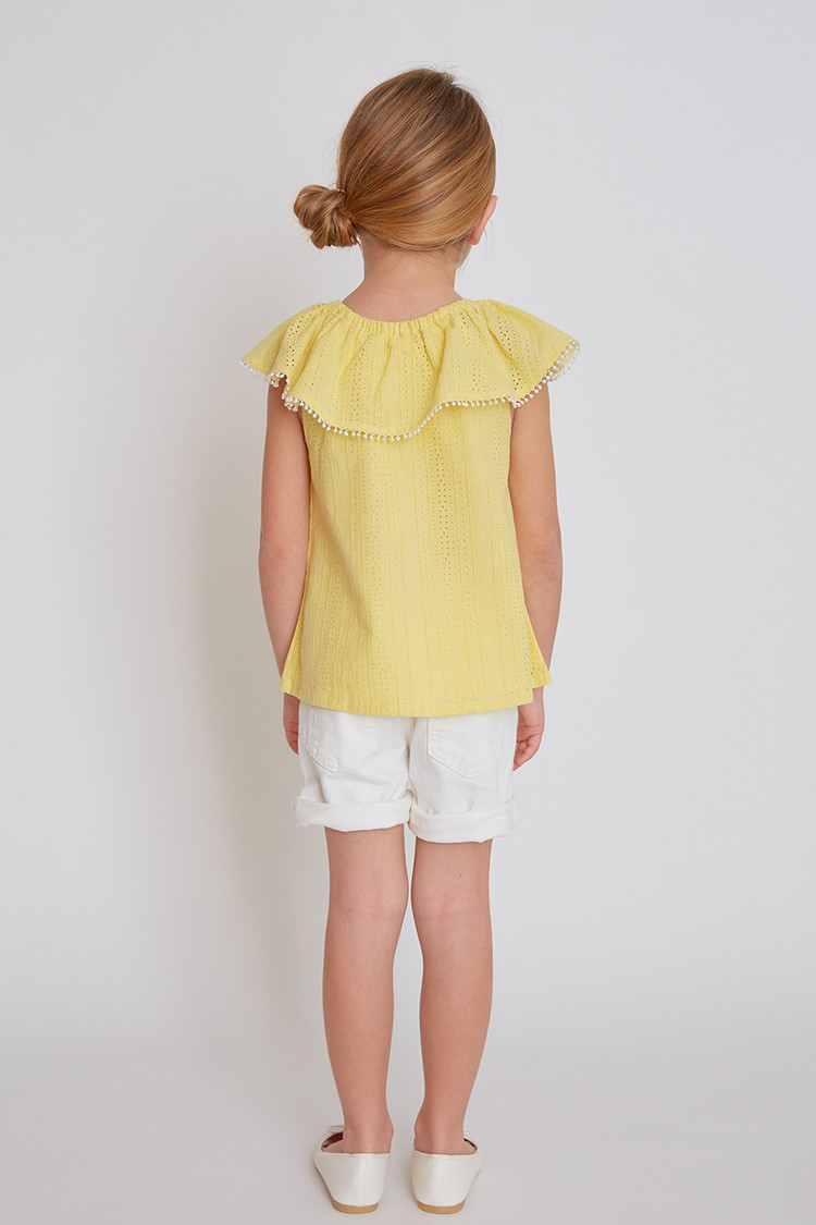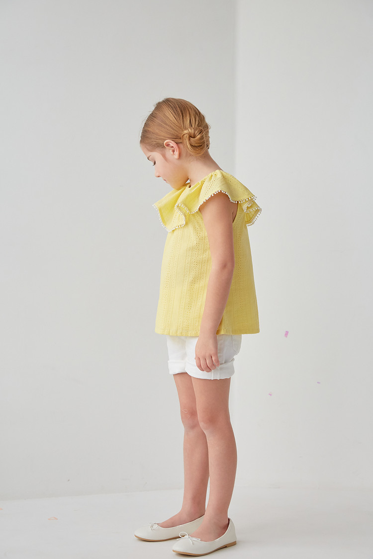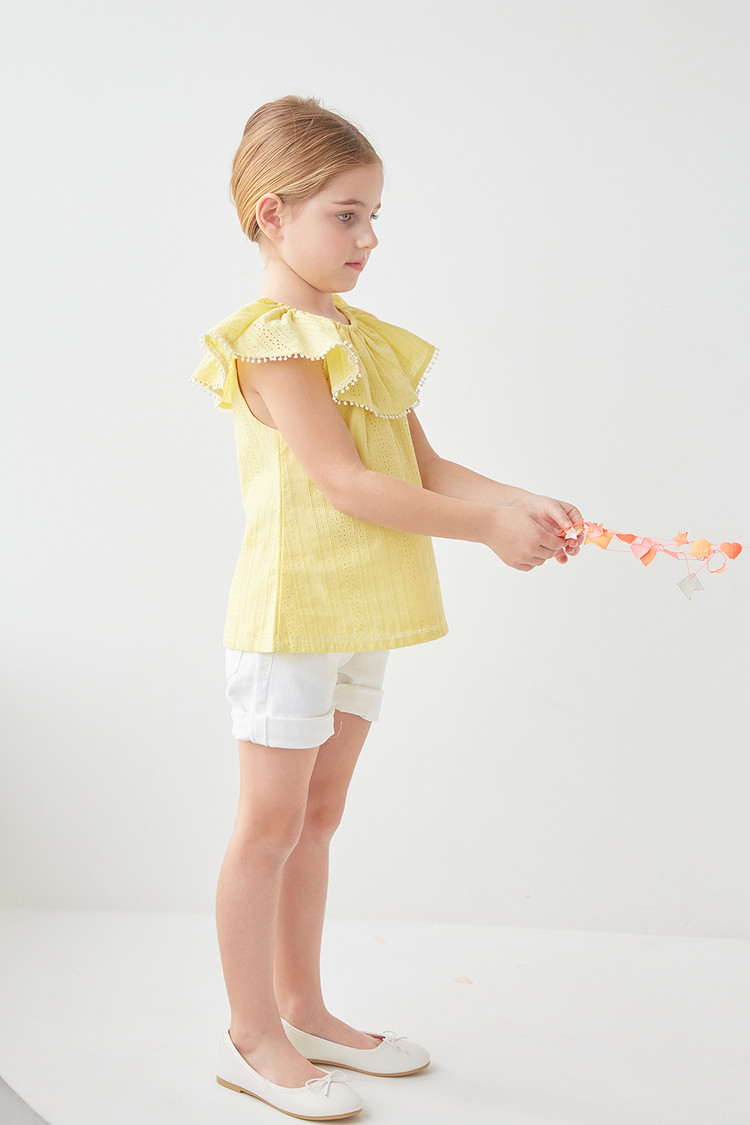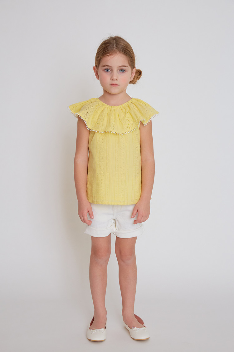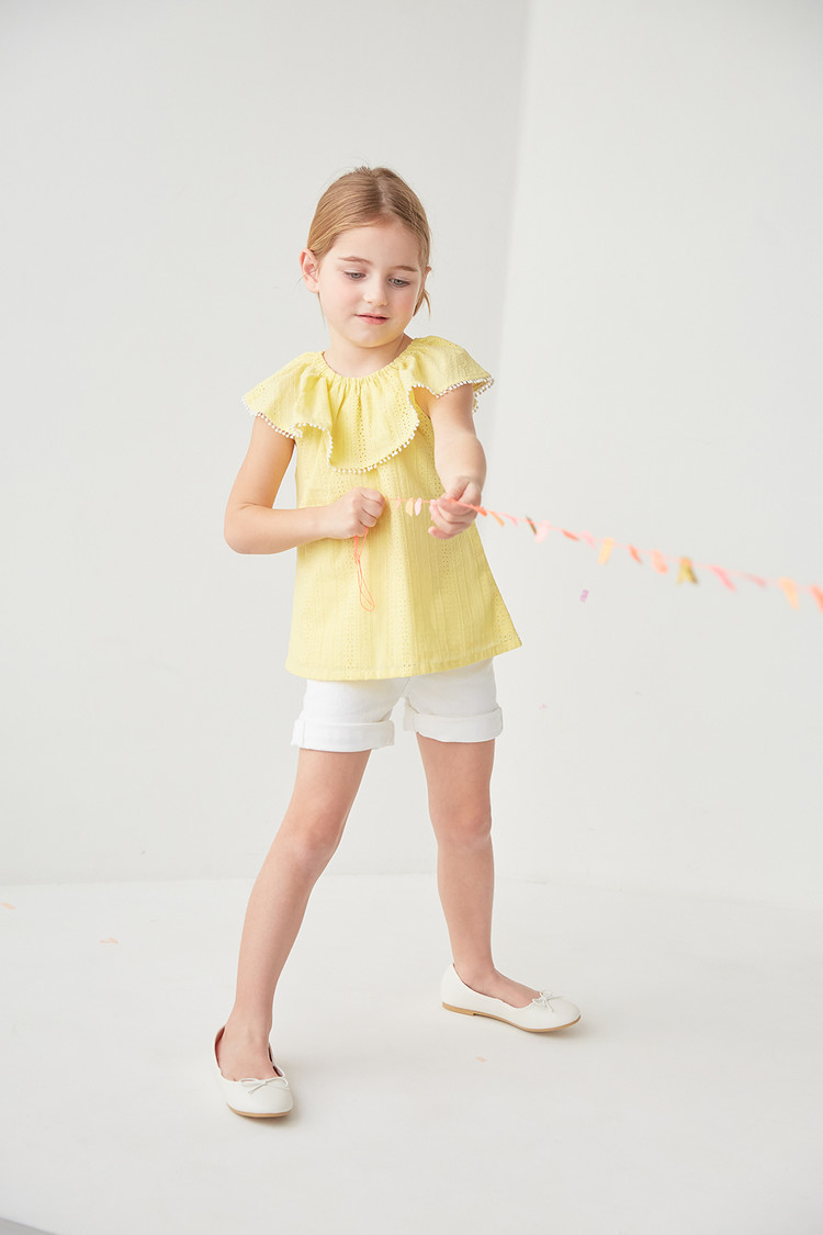 밝은 색상의 옐로우 플로럴 아일렛이 돋보이는 탑입니다. 부드러운 60수 아사 원단의 안감으로 제작 되어 비침 걱정이 없으며, 넥 라인의 고무줄 마감으로 편안하고 쉽게 착용할 수 있습니다. 다가오는 여름을 맞이하여 우리 아이들에게 예쁜 옷을 선물해주세요.