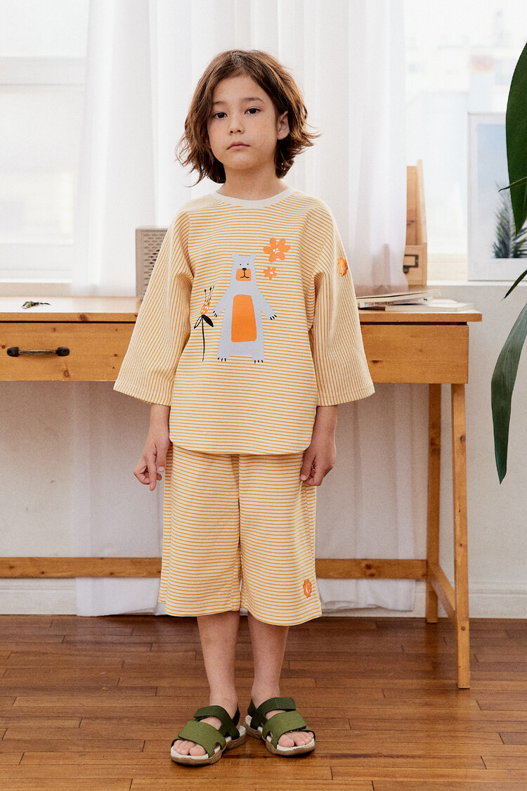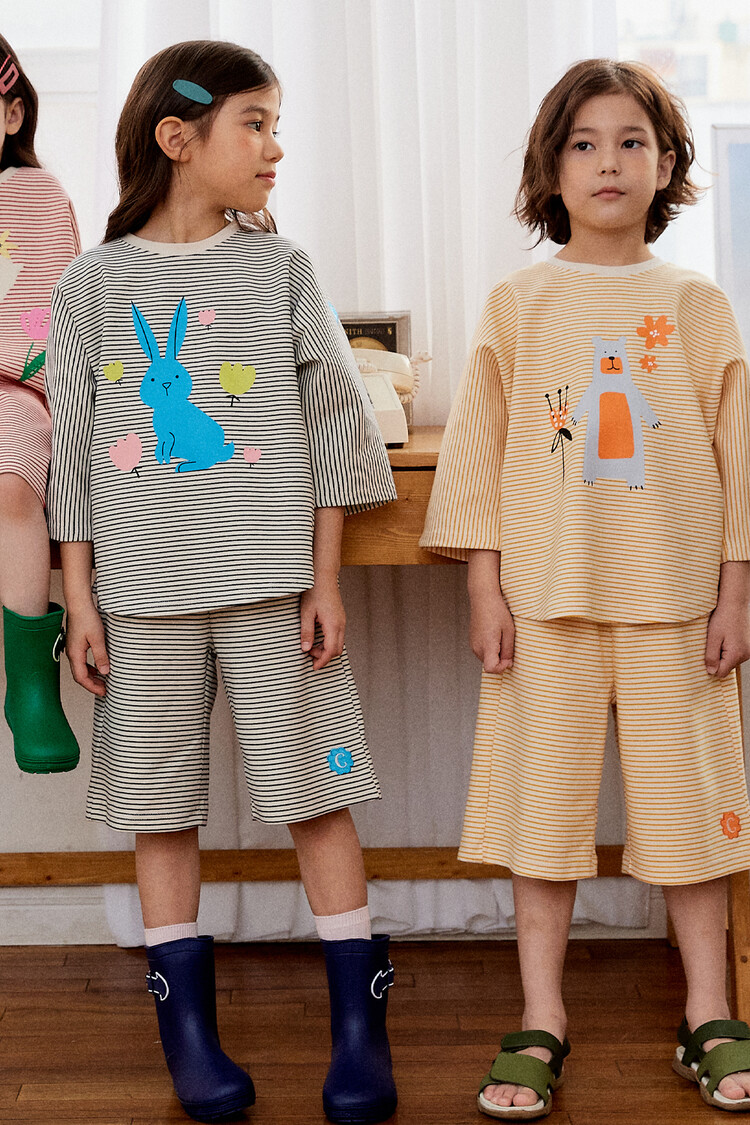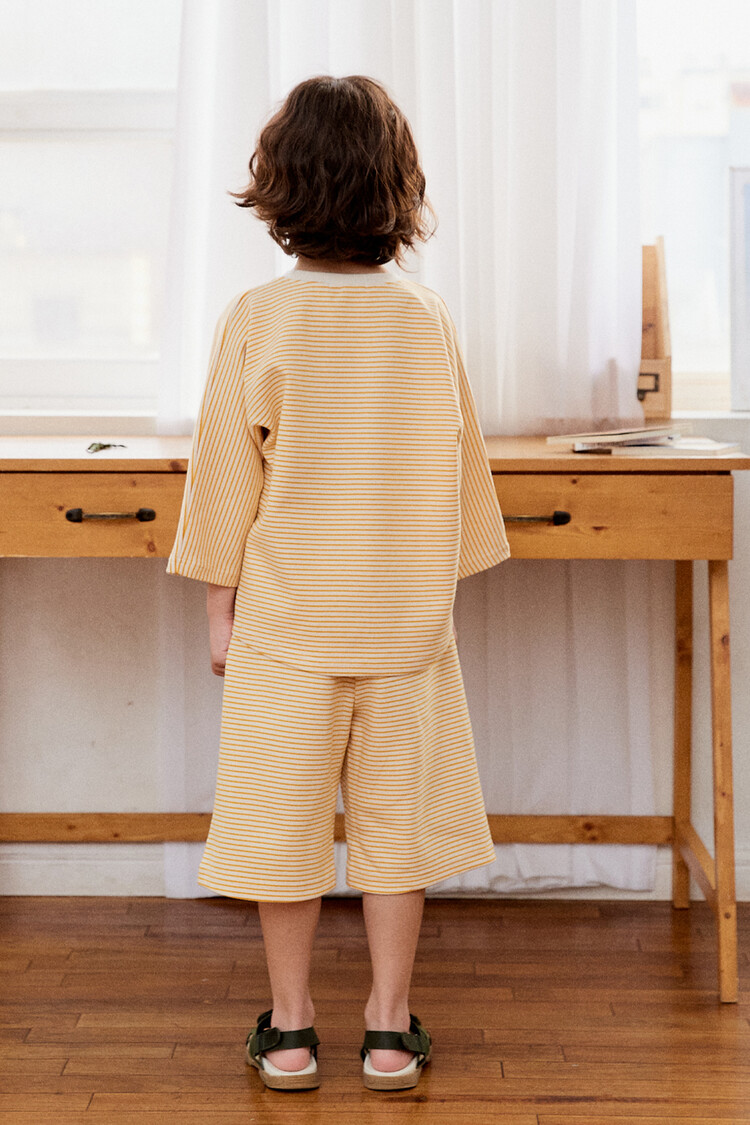 코카의 스트라이프 반바지를 만나보세요. 100%면 스트라이프 원단으로 제작된 이 상품은 고무줄 허리밴드와 주머니로 더욱 편안한 핏을 자랑합니다. 무릎까지 오는 긴듯한 기장으로 코카 로고 마크 자수로 포인트를 주었어요. 가오리 탑과 매치하여 세트 상품으로 연출하셔도 예쁘고 단독으로 편안하게 매일 입히시기 좋은 상품이에요^^