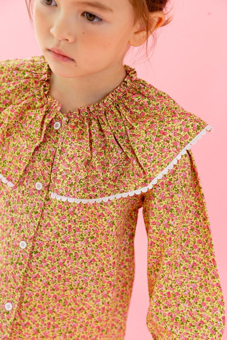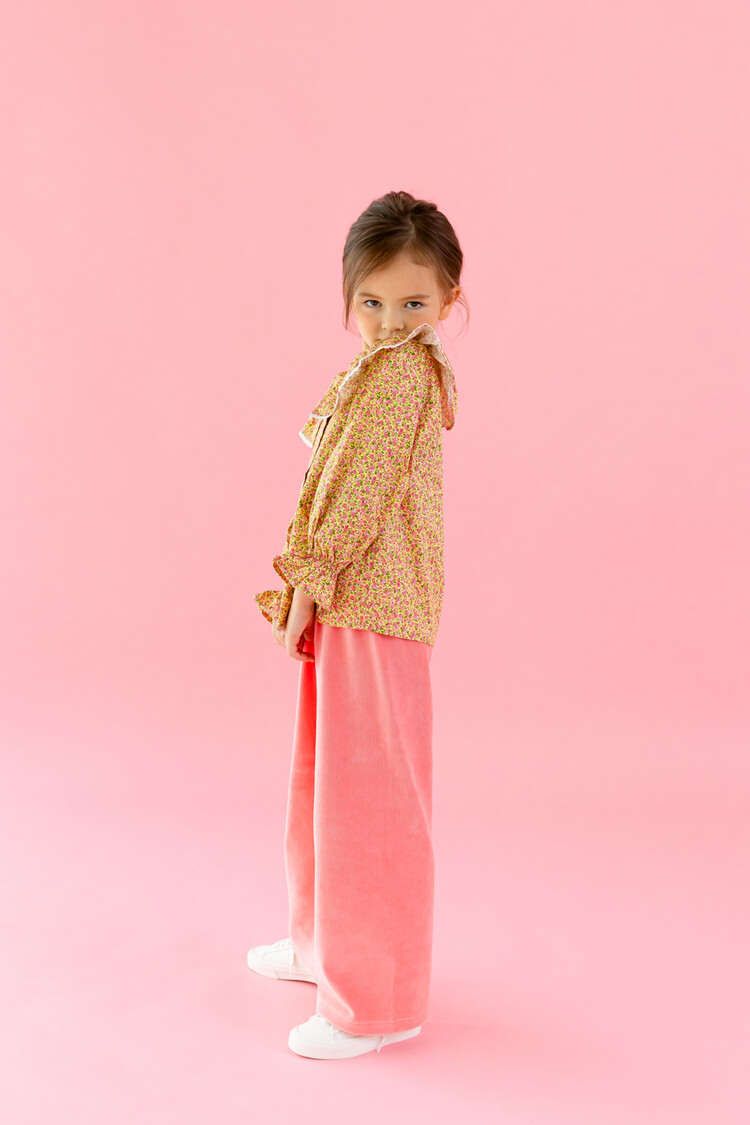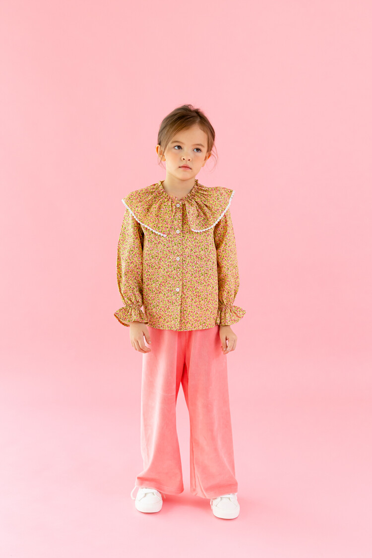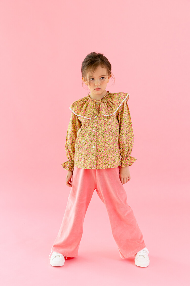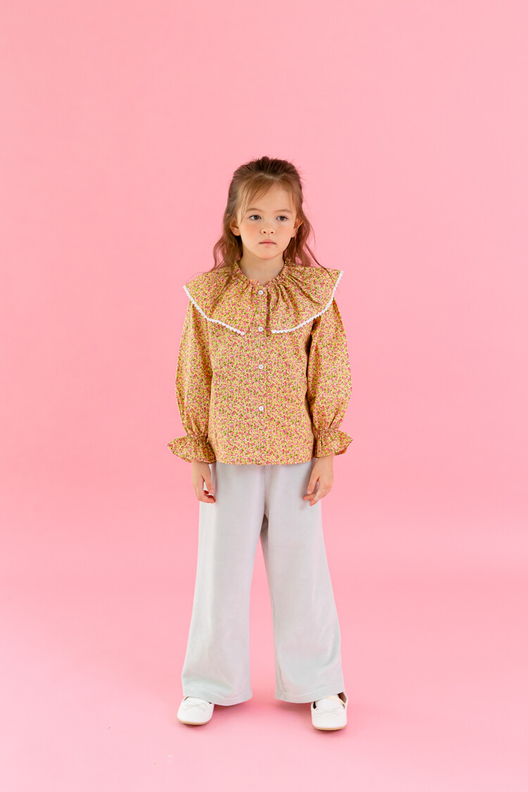 산뜻한 옐로우 베이스에 핑크 플로럴 패턴이 돋보이는 고급스러운 면 소재로 제작한 퓨리턴 칼라 블라우스입니다. 빅 카라 끝에 화이트 레이스 트림을 더하여 더욱 사랑스러운 분위기를 연출합니다. 앞면의 버튼을 이용해 여미는 디자인입니다. 코카 스트레치 코듀로이 팬츠와 매치하여 주말에 어울리는 편안한 스타일을 완성해보세요.