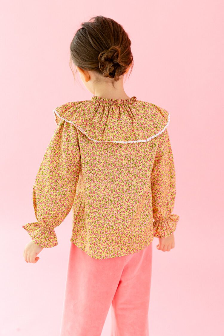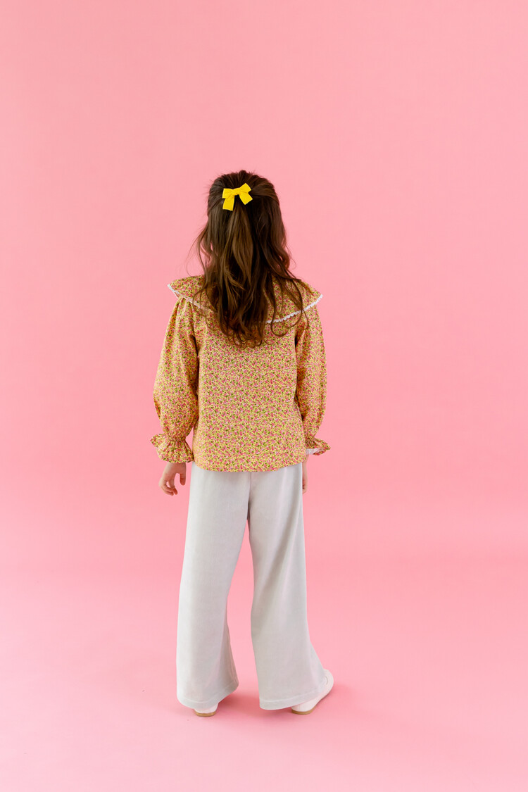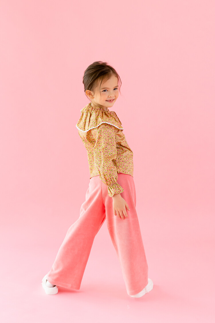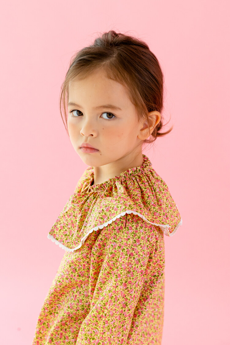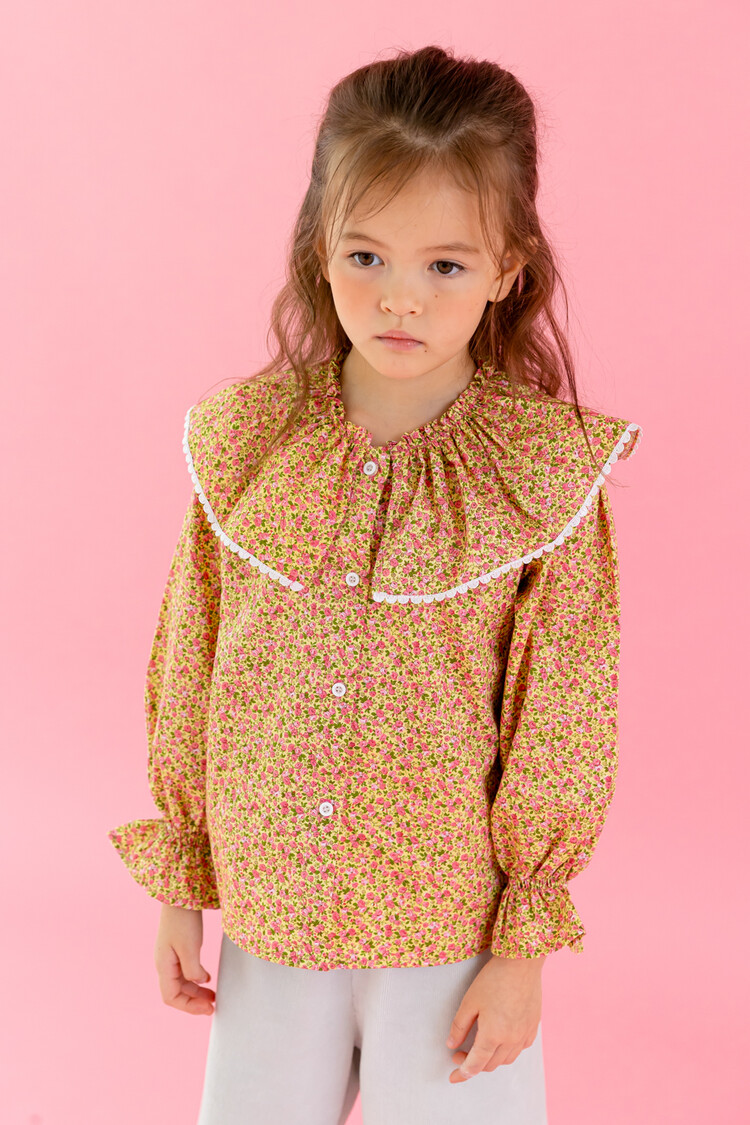 산뜻한 옐로우 베이스에 핑크 플로럴 패턴이 돋보이는 고급스러운 면 소재로 제작한 퓨리턴 칼라 블라우스입니다. 빅 카라 끝에 화이트 레이스 트림을 더하여 더욱 사랑스러운 분위기를 연출합니다. 앞면의 버튼을 이용해 여미는 디자인입니다. 코카 스트레치 코듀로이 팬츠와 매치하여 주말에 어울리는 편안한 스타일을 완성해보세요.