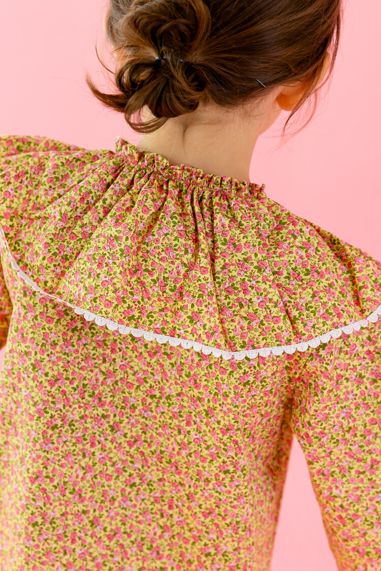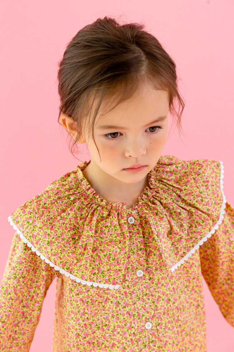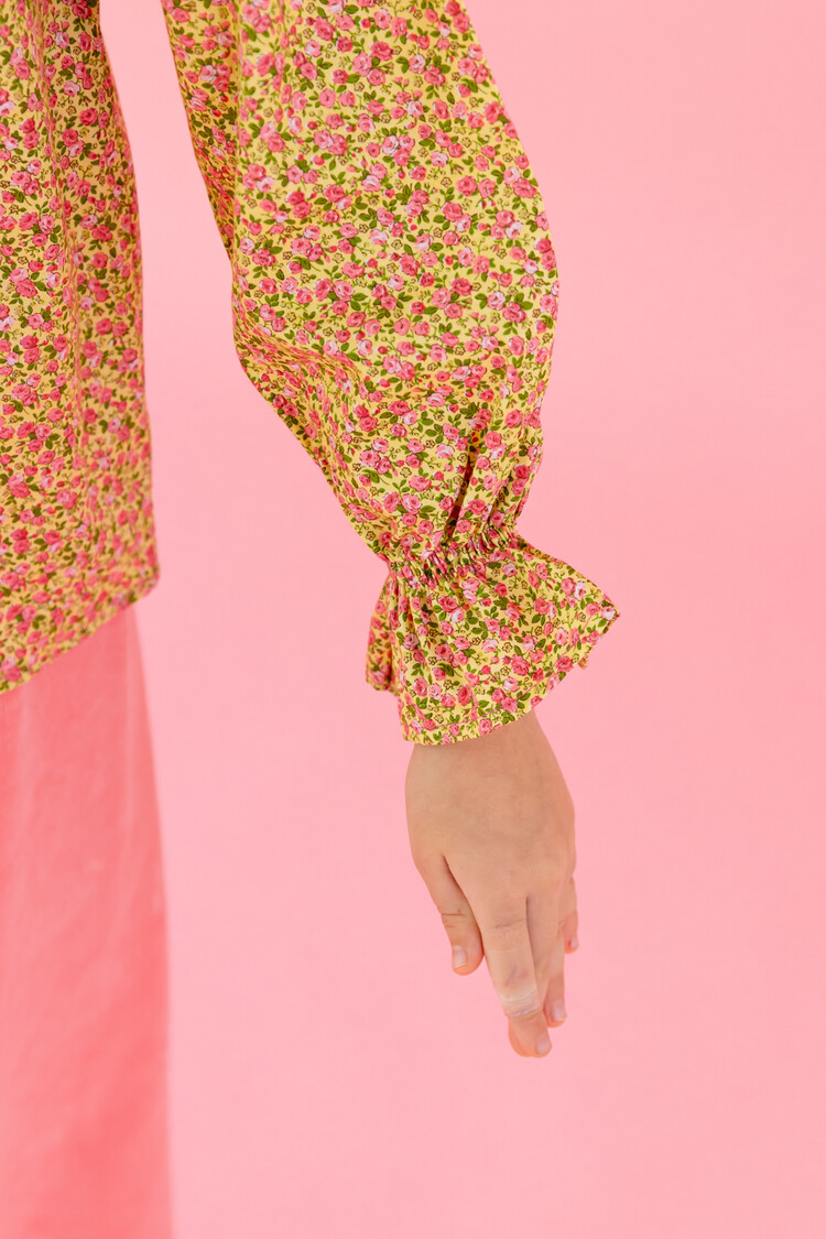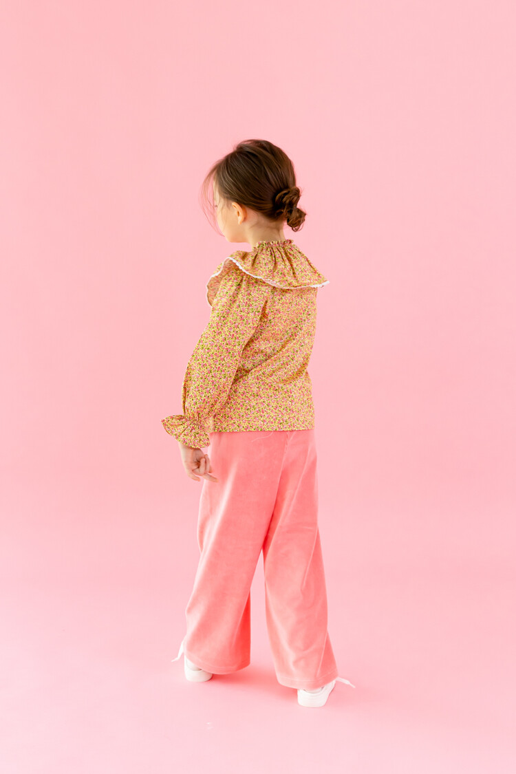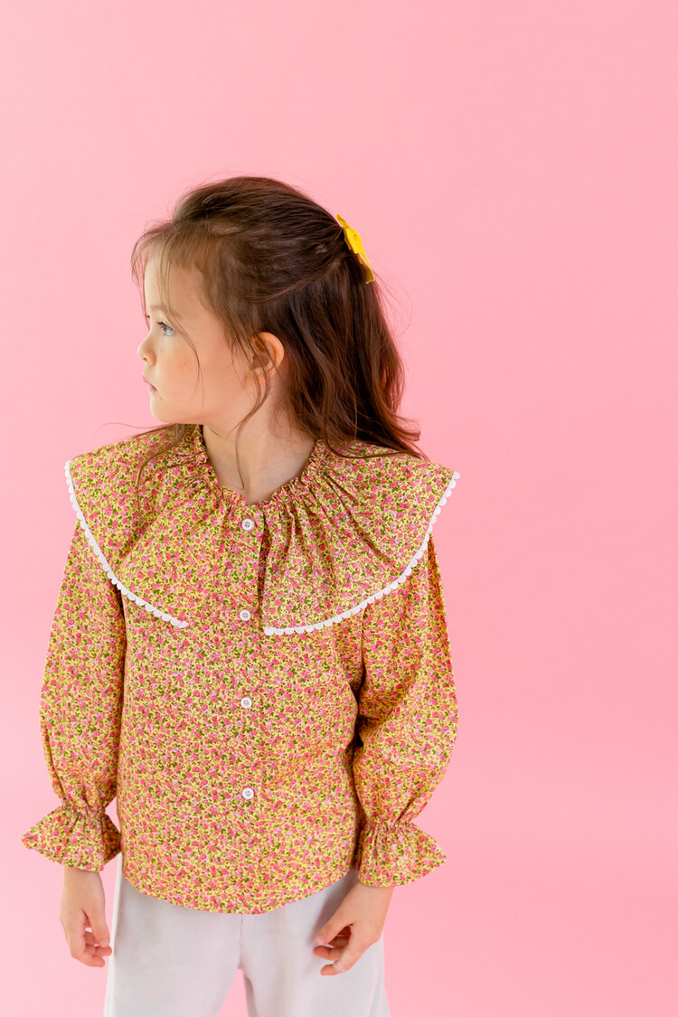 산뜻한 옐로우 베이스에 핑크 플로럴 패턴이 돋보이는 고급스러운 면 소재로 제작한 퓨리턴 칼라 블라우스입니다. 빅 카라 끝에 화이트 레이스 트림을 더하여 더욱 사랑스러운 분위기를 연출합니다. 앞면의 버튼을 이용해 여미는 디자인입니다. 코카 스트레치 코듀로이 팬츠와 매치하여 주말에 어울리는 편안한 스타일을 완성해보세요.