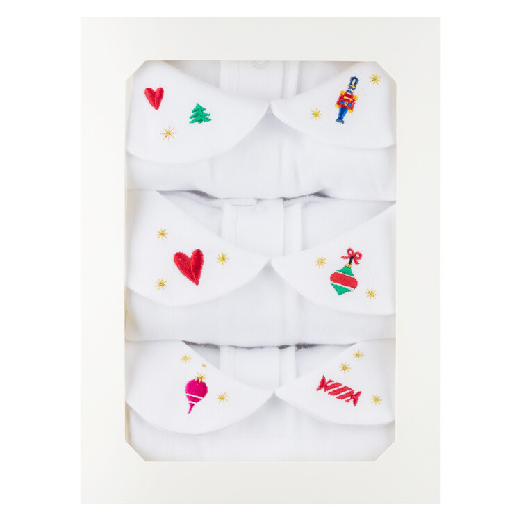 반짝반짝 빛나는 크리스마스 자수로 디자인된 코카의 신생아용 베이비 바디 수트를 만나보세요. 도톰하고 부드러운 100% 면 원단 수트가 우리 아기들을 포근하게 감싸줄거에요. 수트세트는 3사이즈로 3-6개월 6-9개월 9-12개월로 각기 다른 자수로 이루어진 3장의 바디수트로 구성되었습니다. 크리스마스 또는 연말에 입히실 수 있는 제품으로 선보이는 리미티드 에디션 홀리데이 베이비 바디수트 랍니다.