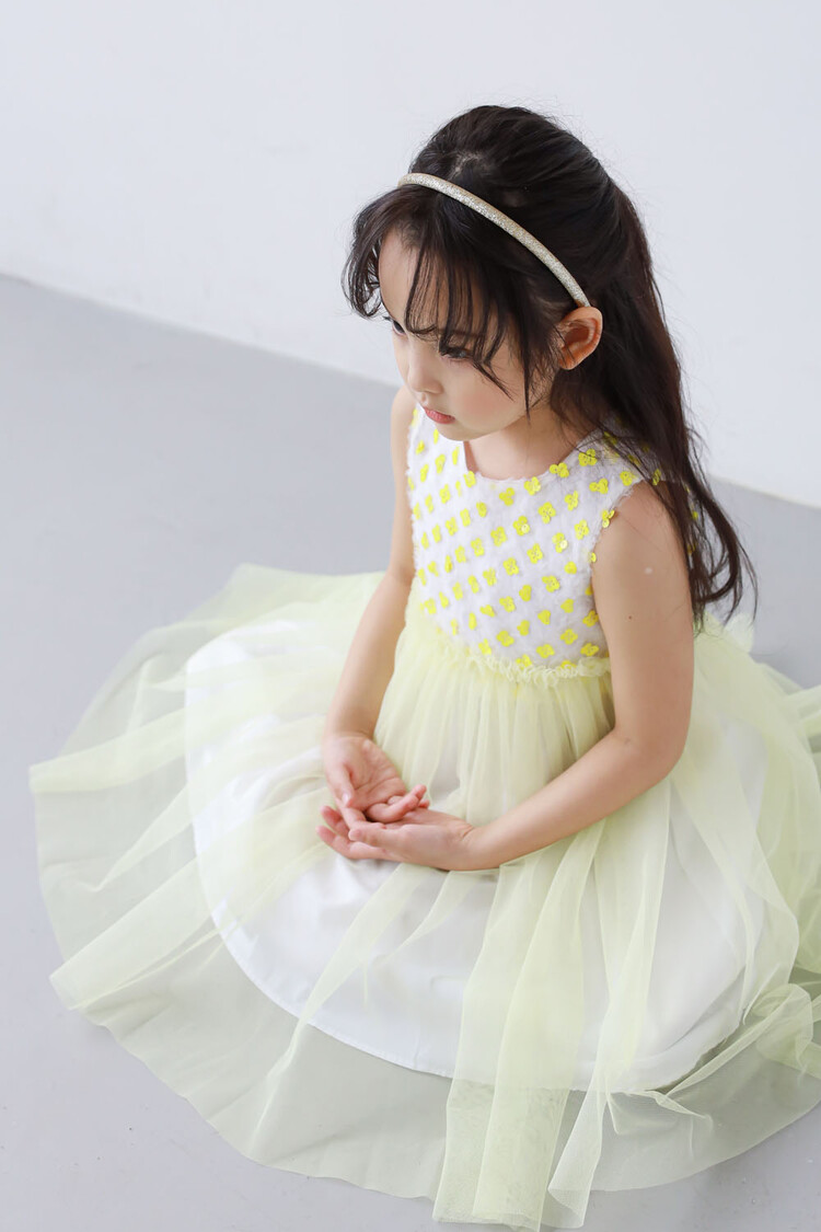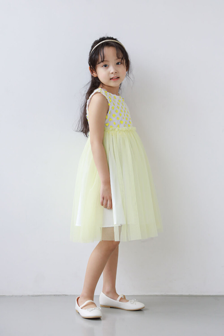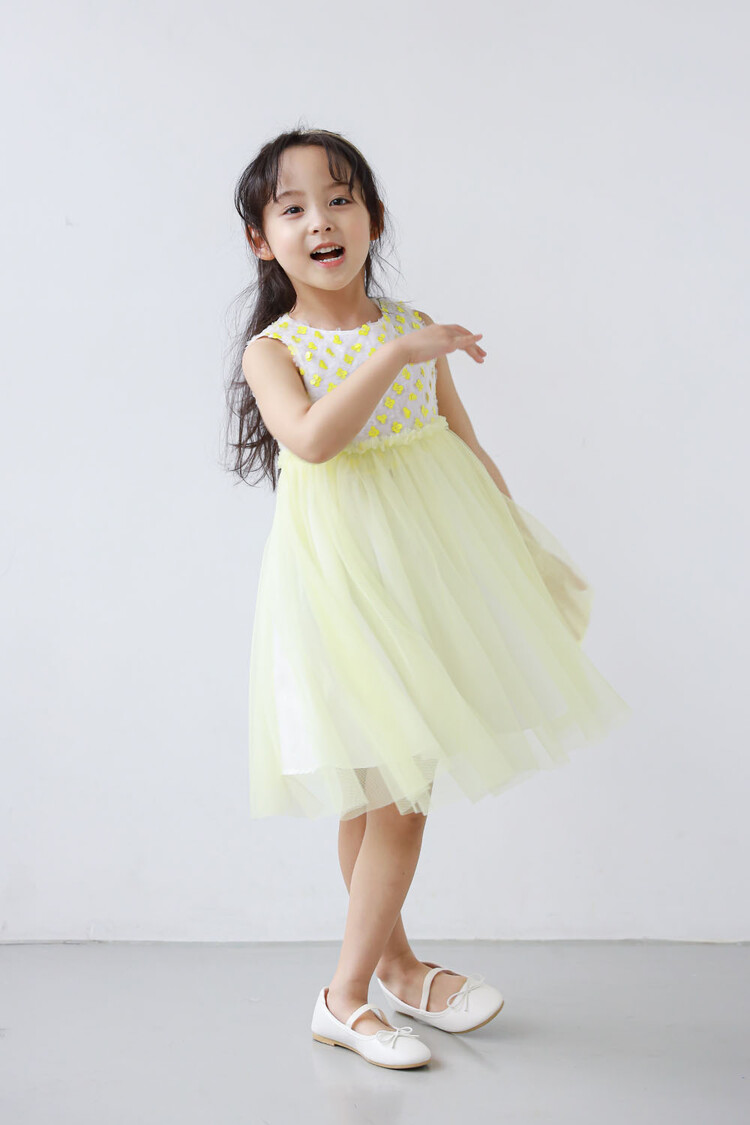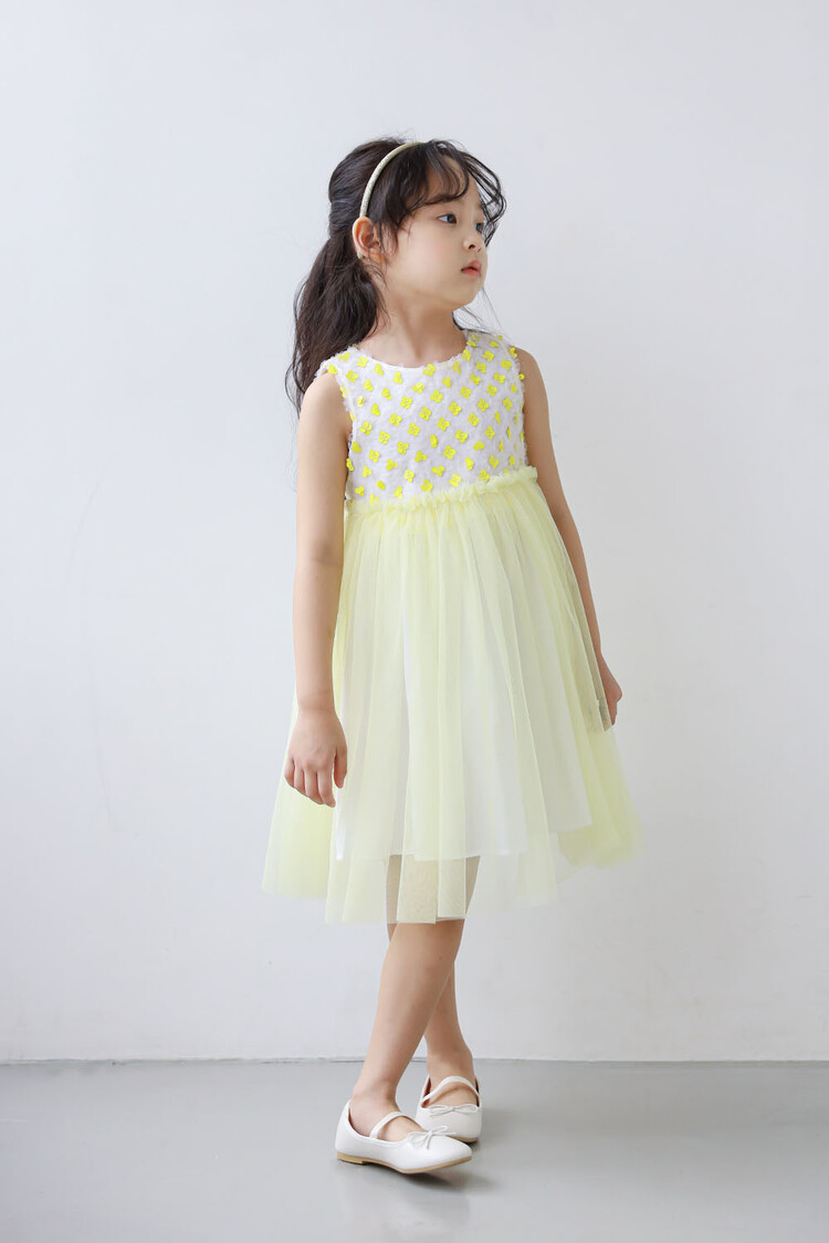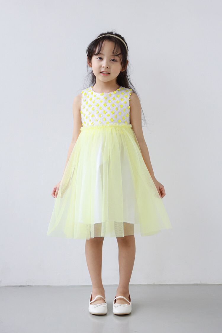 상큼한 레몬칼라 비즈장식 원단으로 제작된 화려한 코카의 봄 드레스를 만나보세요! 비즈 장식의 화려한 몸판과 풍성한 샤가 조화를 이루는 디자인입니다. 면소재의 시원한 안감이 덧대어져 비침걱정이 없으며 화이트 티셔츠 또는 가디건과 연출하여 우리 아이들을 예쁜 공주님으로 만들어주세요!