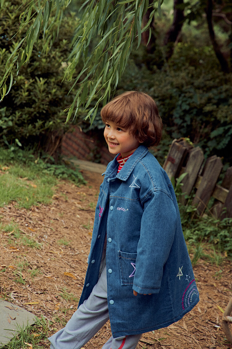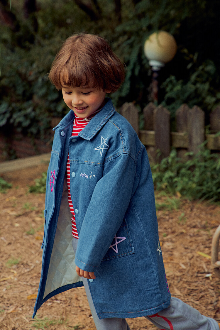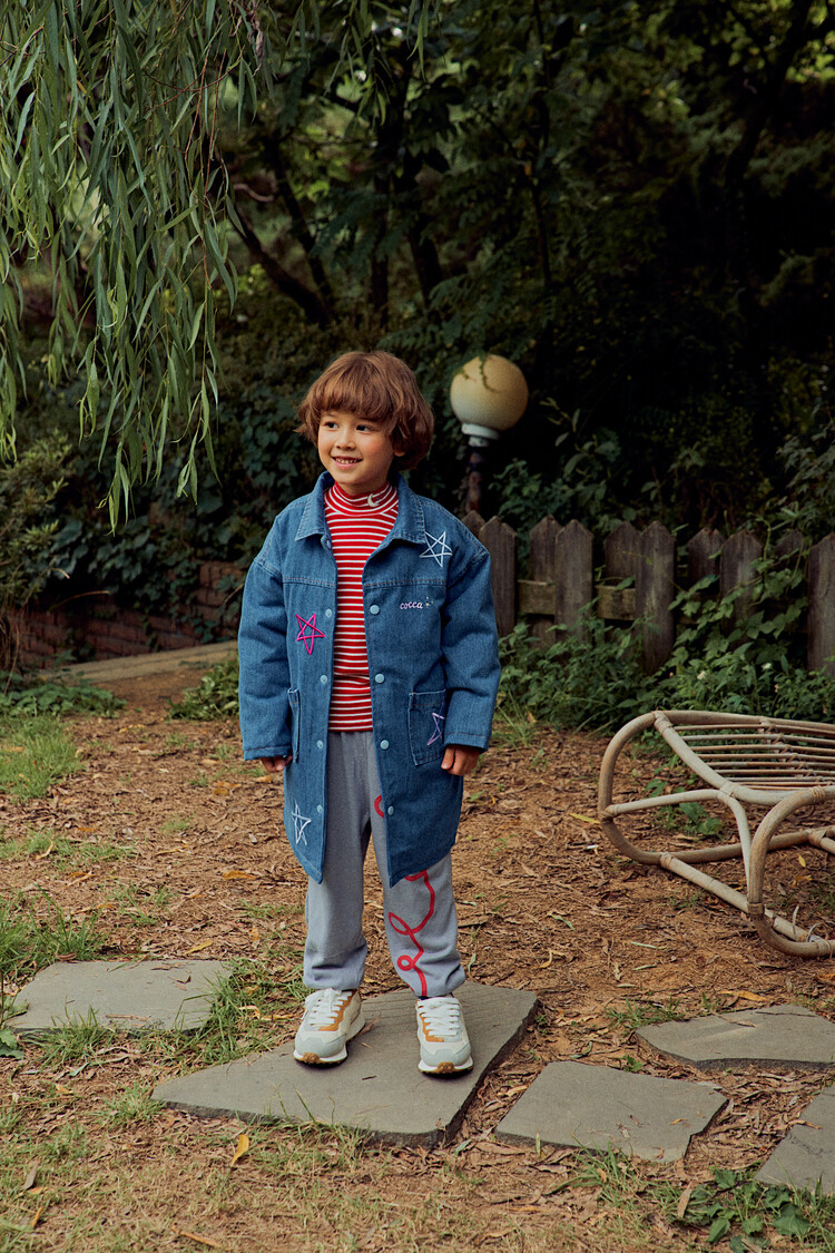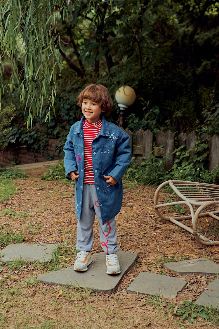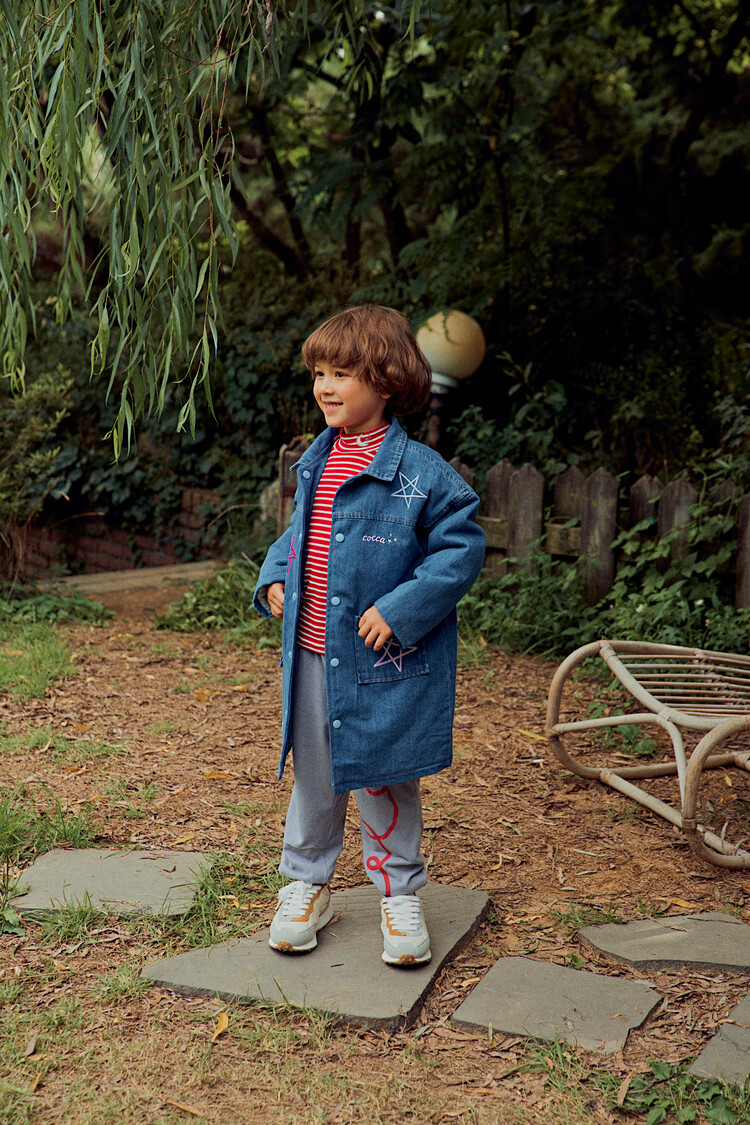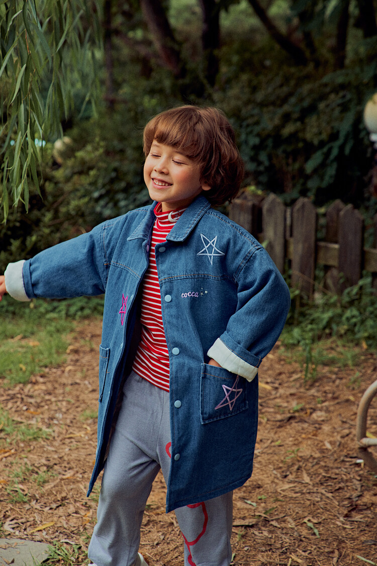 올 겨울을 책임져줄 코카의 스타 데님 오버핏 패딩 코트입니다. 고급스러운 칼라로 워싱된 데님과 3온스 솜을 덧댄 패딩 안감이 더해져 더욱 따뜻하고 편하게 입을 수 있는 가을, 겨울용 코트 랍니다. 앞면의 큼지막한 쨍한 칼라의 별 자수와 뒷면의 코카 알파벳으로 만든 무지개 자수가 더해져 더욱 재미있는 코트로 탄생하였어요. 마감은 하늘색 스냅으로 마무리하여 더욱 간편한 여밈을 제공하며, 남아 여아 모두 츄리닝 세트와 연출하면 편안하고 스타일리시한 룩 완성이에요! 앞면도 톡톡튀고 뒷면에도 디테일이 있는 고퀄리티의 자수를 듬뿍 넣은 코트랍니다. 올 겨울 정말 유용하게 입히실 수 있는 자켓이랍니다. 나만 갖고 싶은 톡톡 튀는 코카 가을 겨울용 코트는 모두의 시선을 사로 잡을거에요! 우리 아이들에게 꼭 선물해주세요^^